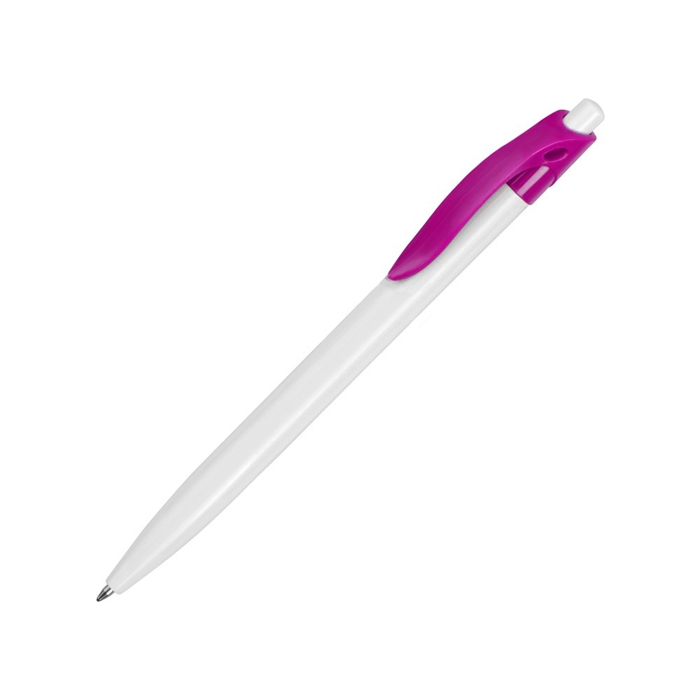 Стильная пластиковая ручка с ярким цветным клипом и белым корпусом отлично подойдет для нанесения логотипов и рекламной информации. Нажимной механизм.