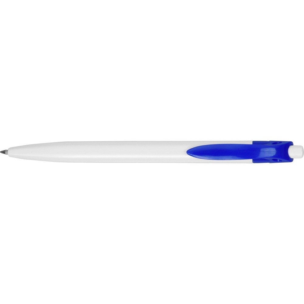 Стильная пластиковая ручка с ярким цветным клипом и белым корпусом отлично подойдет для нанесения логотипов и рекламной информации. Нажимной механизм.