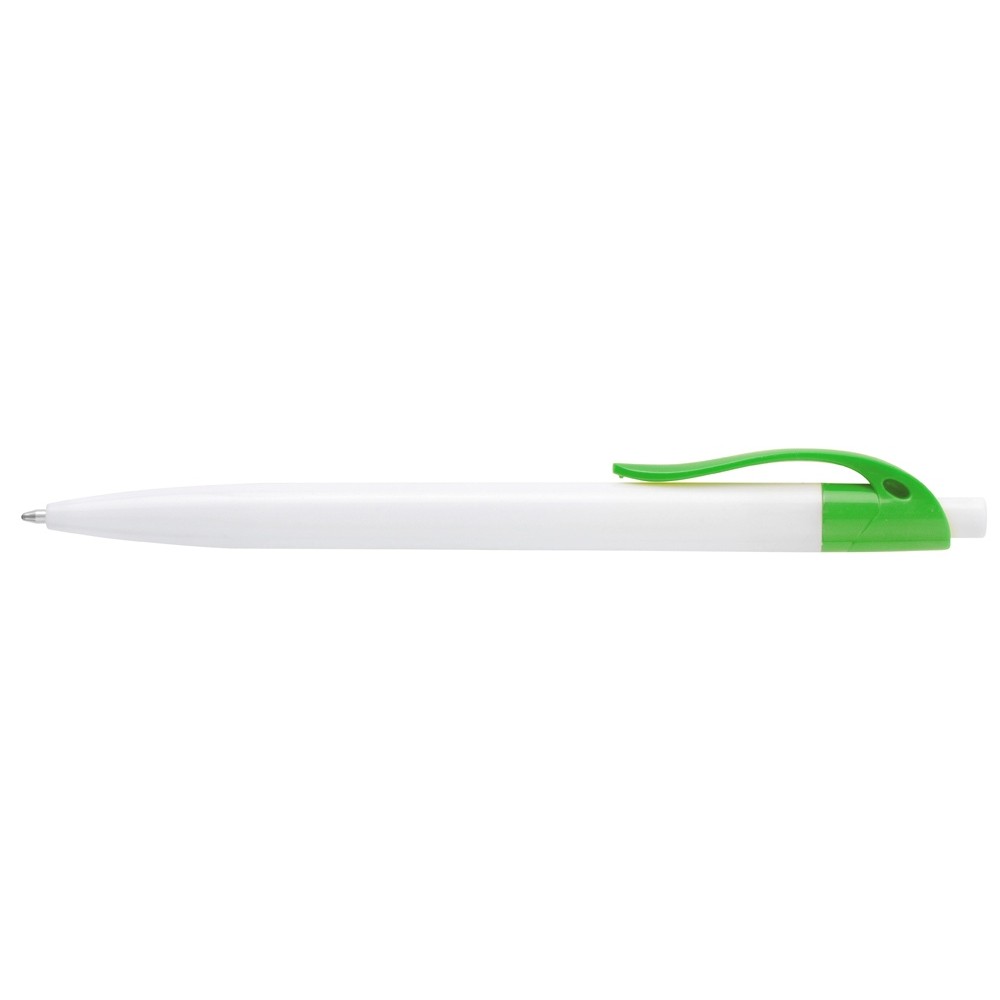 Стильная пластиковая ручка с ярким цветным клипом и белым корпусом отлично подойдет для нанесения логотипов и рекламной информации. Нажимной механизм.