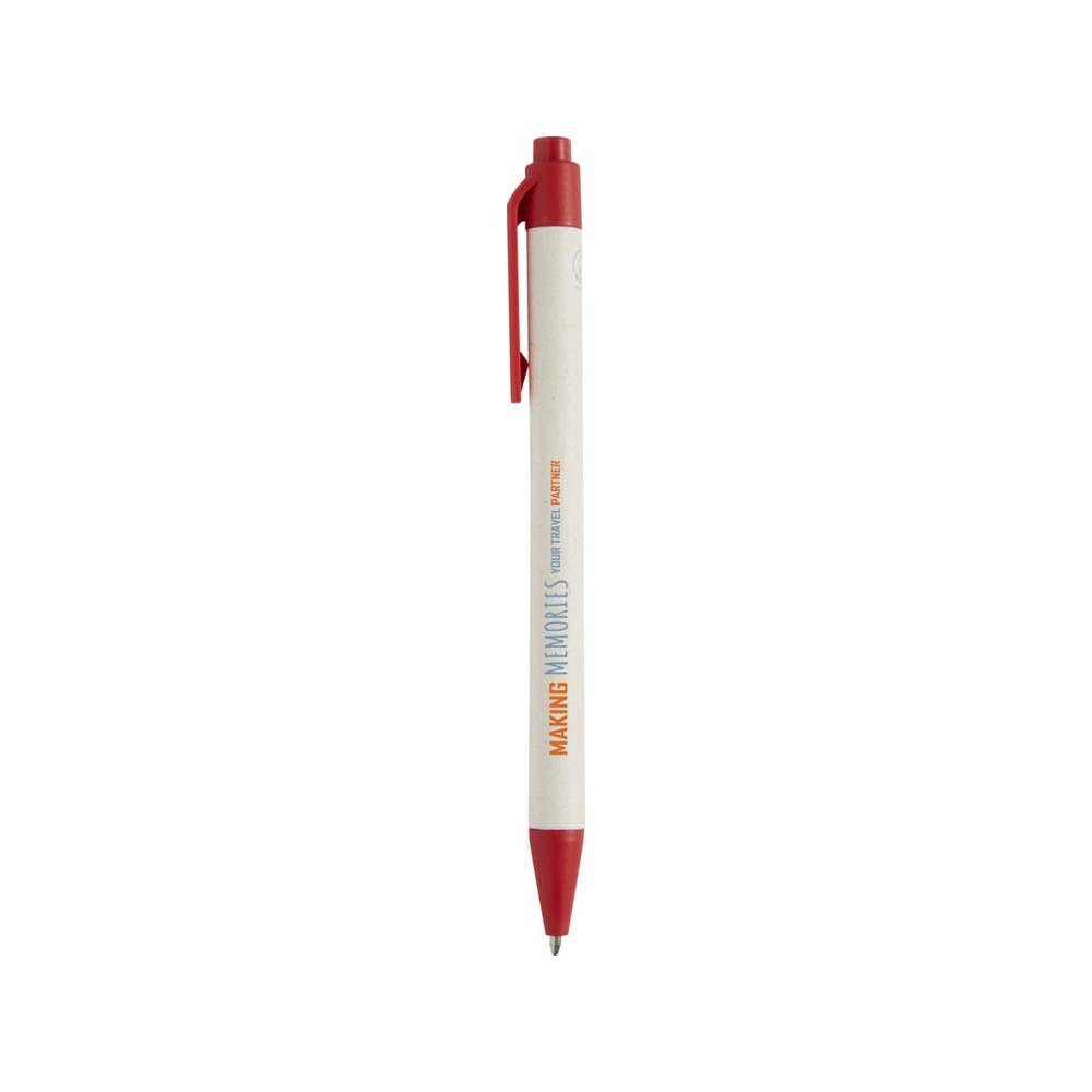 Шариковая ручка с кнопочным механизмом и корпусом из переработанных коробок из-под молока (до 70%). Кнопка, зажим и наконечник изготовлены из PLA-пластика. Картонные коробки из-под молока собираются, сортируются, перерабатываются и превращаются в бумагу, таким образом действительно превращая мусор во что-то полезное.