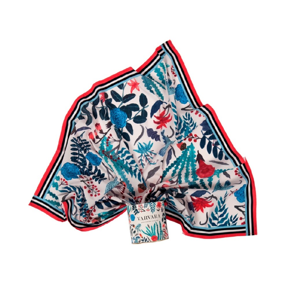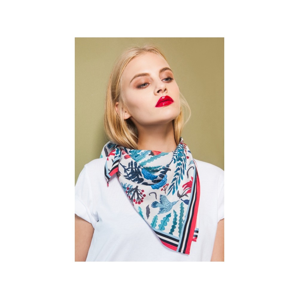 Платок из искусственного шелка саржевого плетения (твил) размером 70*70 см., с авторским принтом «Голубые розы».