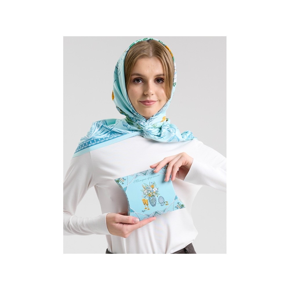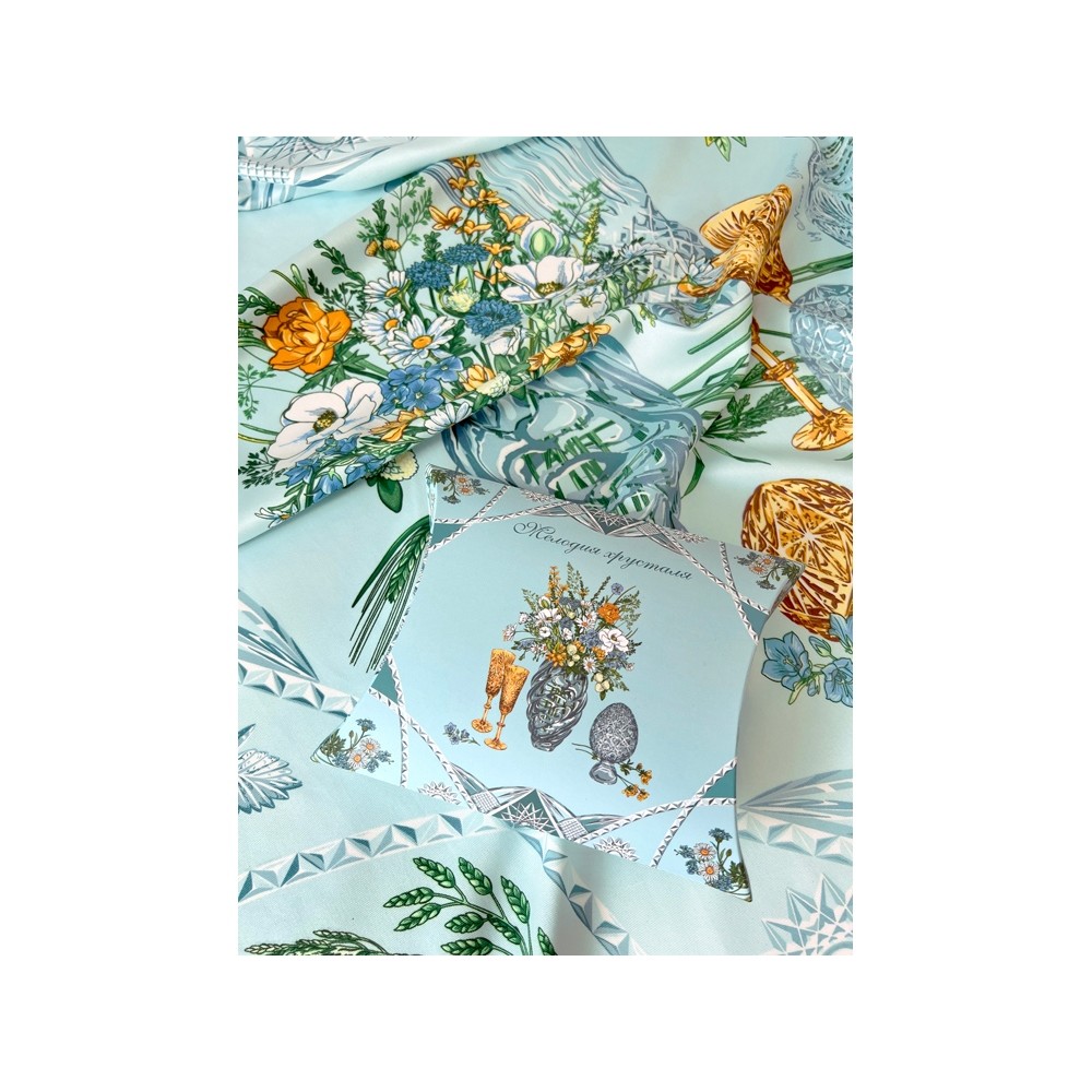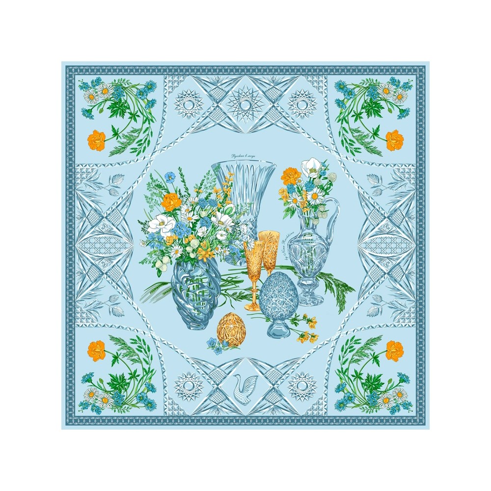 Дизайн платка связан со стилевой эстетикой советской школы натюрморта. Перед нами ажурная скатерть стола, декорированного композицией из хрусталя и полевыми цветами. Нежные переливы сине-голубых тонов подчеркнуты ярко-желтыми и белыми бутонами, стеблями сочных трав и золотистыми бокалами. Ажур скатерти вторит хрустальному узору фужеров, ваз и сувенирных пасхальных яиц, задавая душевное настроение.