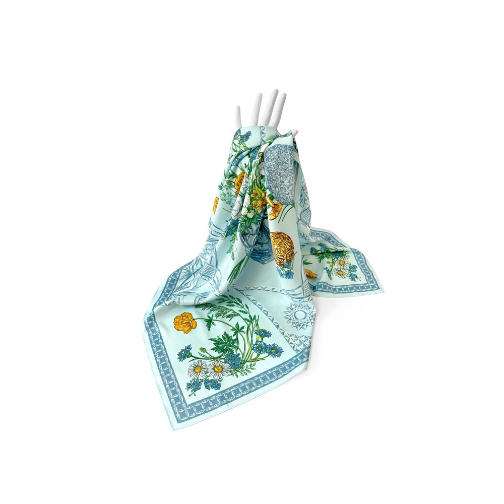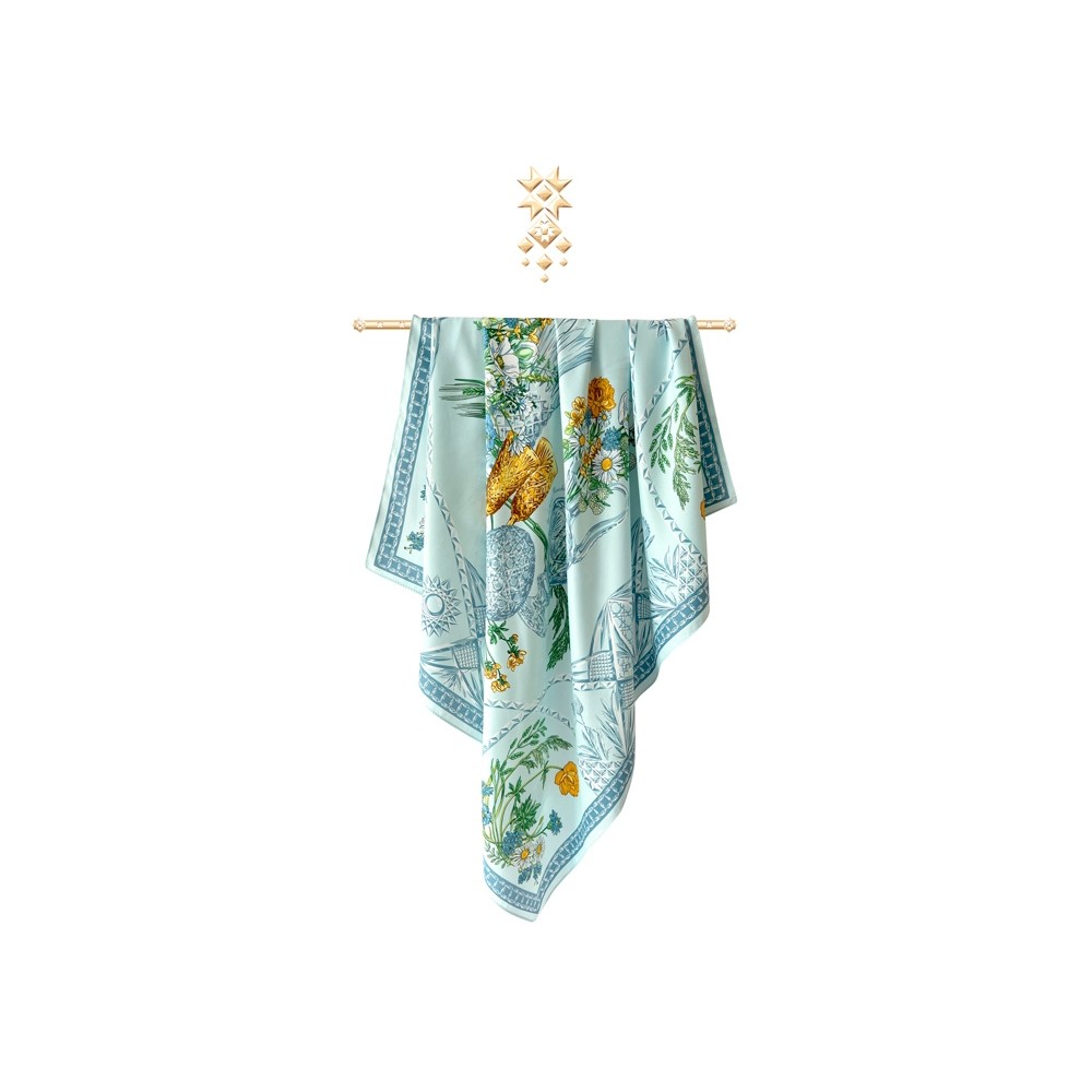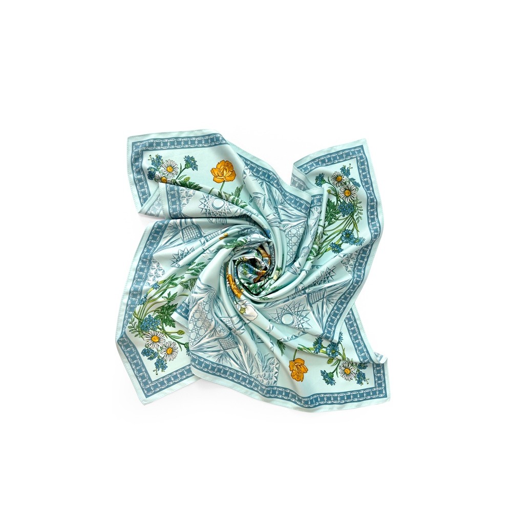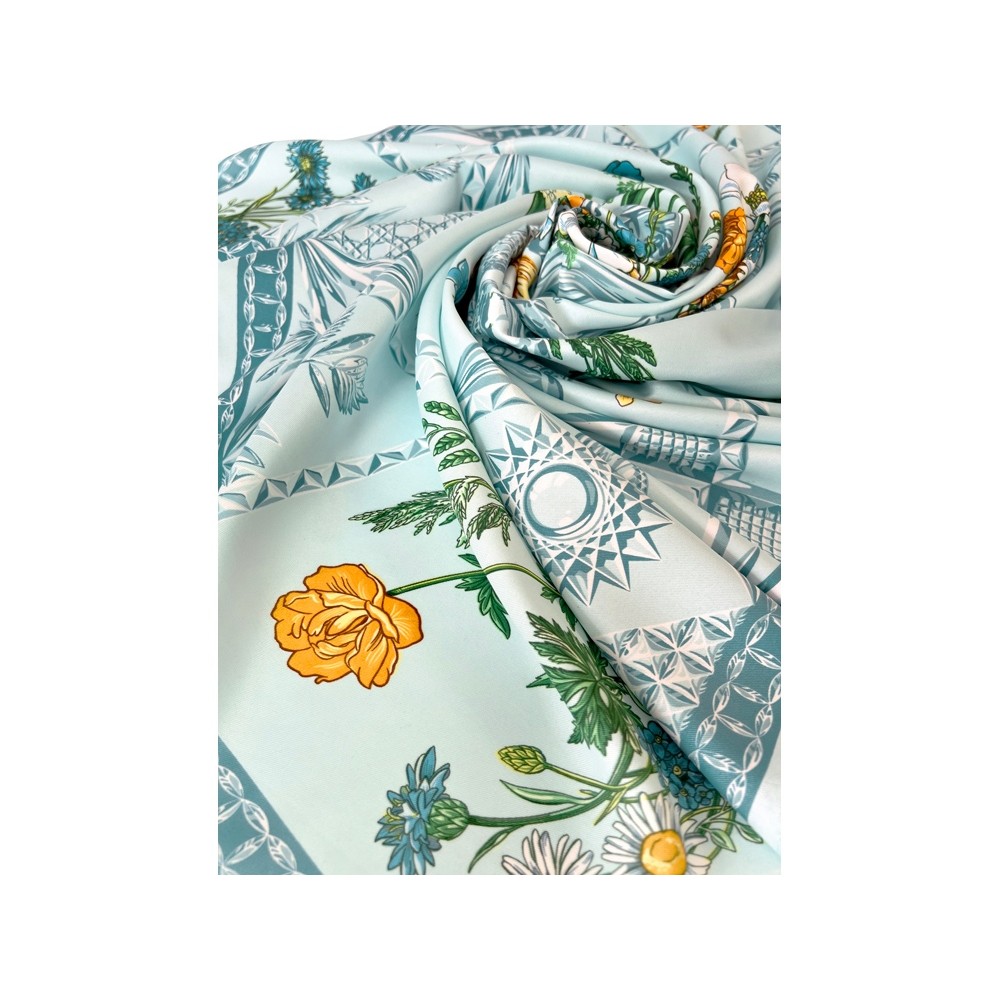 Дизайн платка связан со стилевой эстетикой советской школы натюрморта. Перед нами ажурная скатерть стола, декорированного композицией из хрусталя и полевыми цветами. Нежные переливы сине-голубых тонов подчеркнуты ярко-желтыми и белыми бутонами, стеблями сочных трав и золотистыми бокалами. Ажур скатерти вторит хрустальному узору фужеров, ваз и сувенирных пасхальных яиц, задавая душевное настроение.