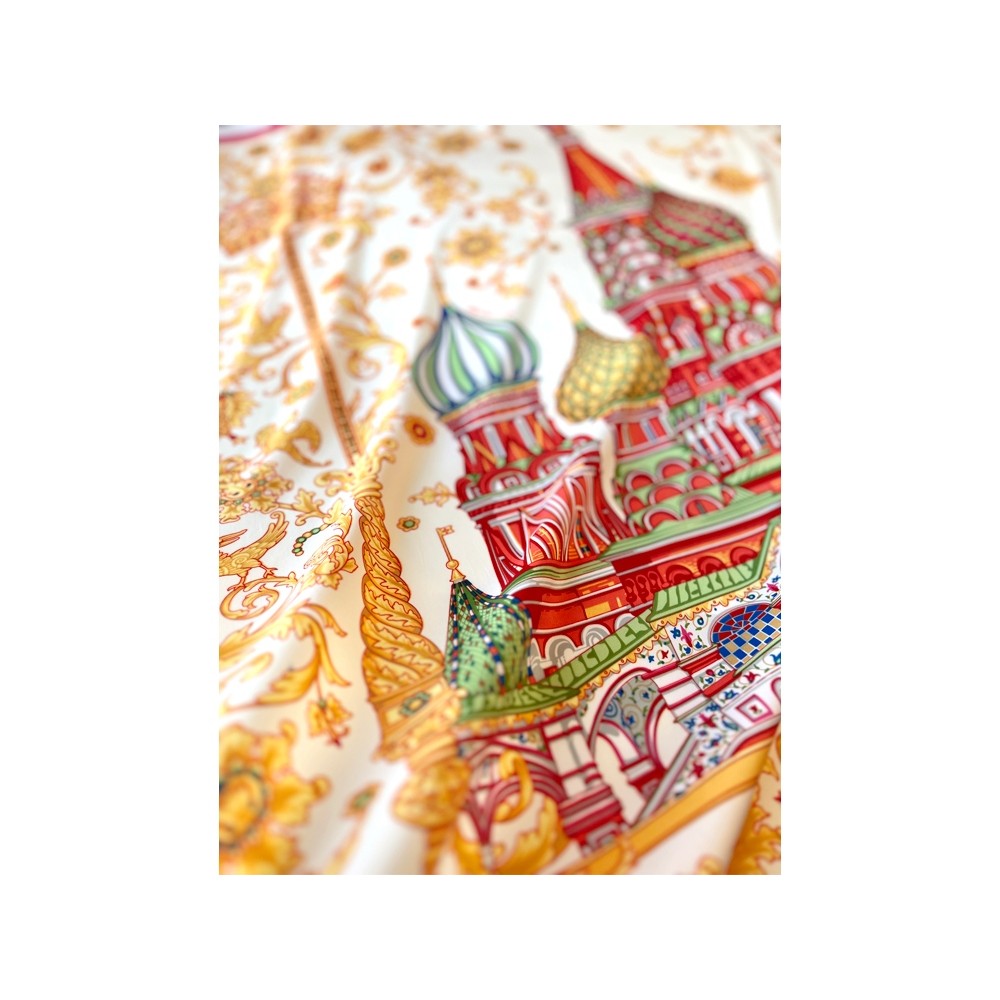 Сказочный вид собора отражен на золотом фоне новинки от бренда «Русские в моде» by Nina Ruchkina. Настоящее восьмое “чудо Света” обрамлено царскими коронами и райскими птицами, свидетельствующими об уникальности и роскоши этой исторической достопримечательности, отстроенной 1 октября 1552 года на праздник Покрова Богородицы.