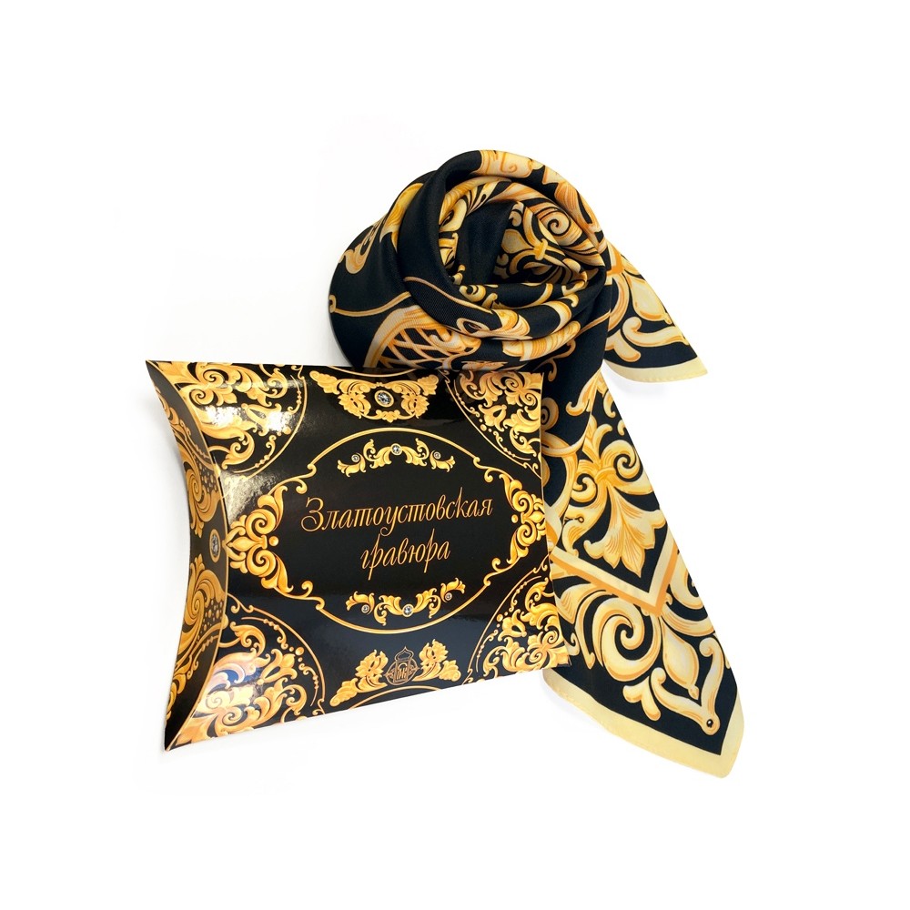 Платок «Златоуствоская гравюра» от бренда «Русские в моде» - это роскошь, изящество и характер, оригинальный аксессуар и настроение праздника, который всегда с Вами.