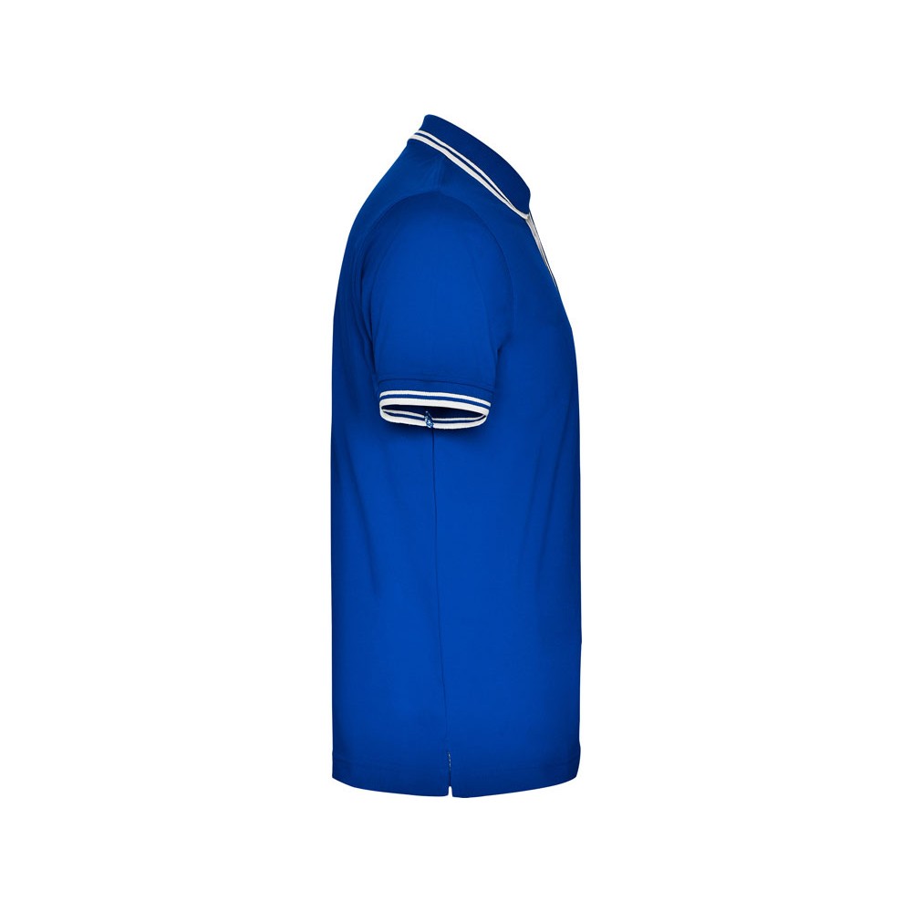 Поло с коротким рукавом. Воротник и манжеты из риба 1х1 с отделкой двойной контрастной плоской. Внутренняя планка контрастного цвета, застежка на 3 пуговицы. Разрезы в боковых швах. Премиальное плотное пике 230 гр.