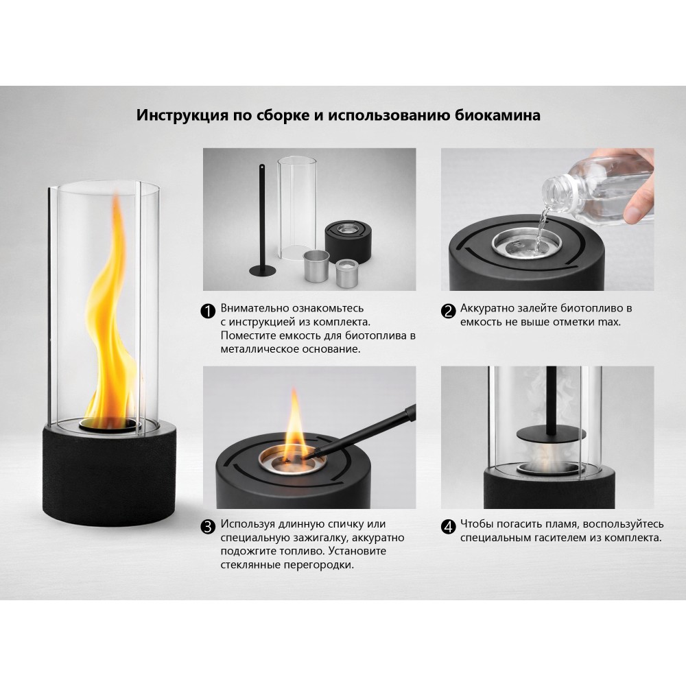 Перед использованием обязательно ознакомьтесь с инструкцией и соблюдайте меры безопасности. Не оставляйте горящий биокамин без присмотра, а топливо храните в недоступном для детей и домашних животных месте.