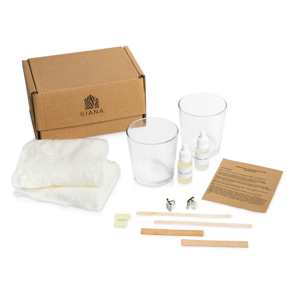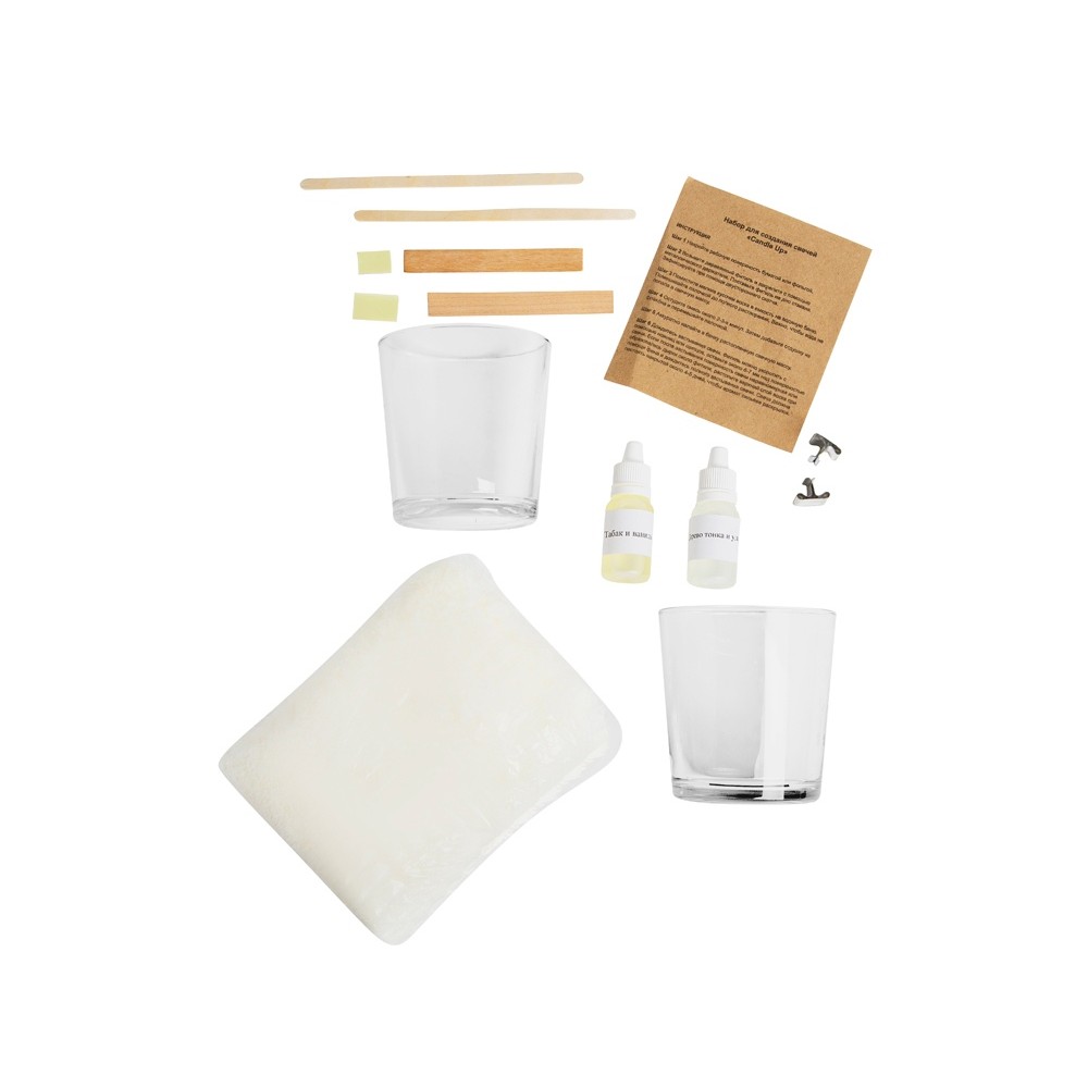 Комплектность свечная масса, 2 стеклянных стакана, 2 фитиля деревянных, 2 держателя для фитиля, 2 вида отдушки, инструкция