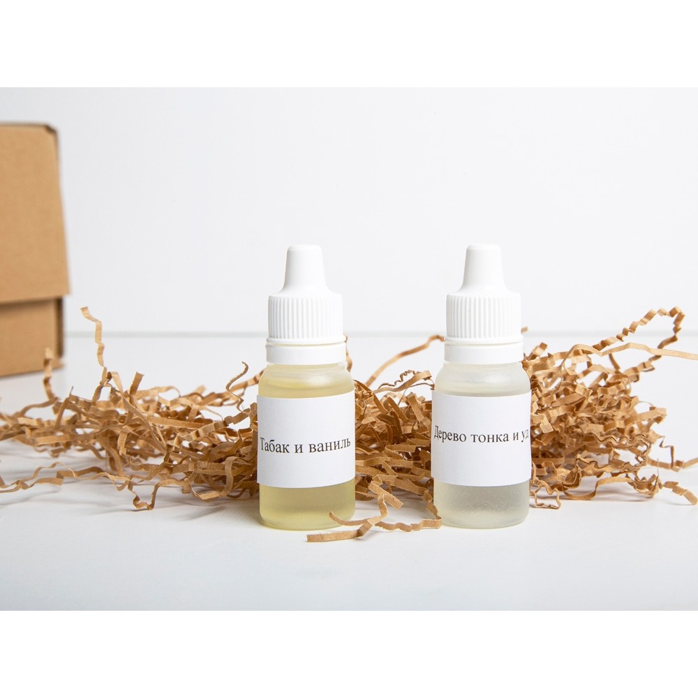 В набор входят сама свечная масса экологичного состава (соевый и кокосовый воск, пищевой парафин), 2 стеклянных стакана, деревянные фитили и держатели, отдушки с ароматами уд-бобы тонка и табак-ваниль и ленточка для декора.