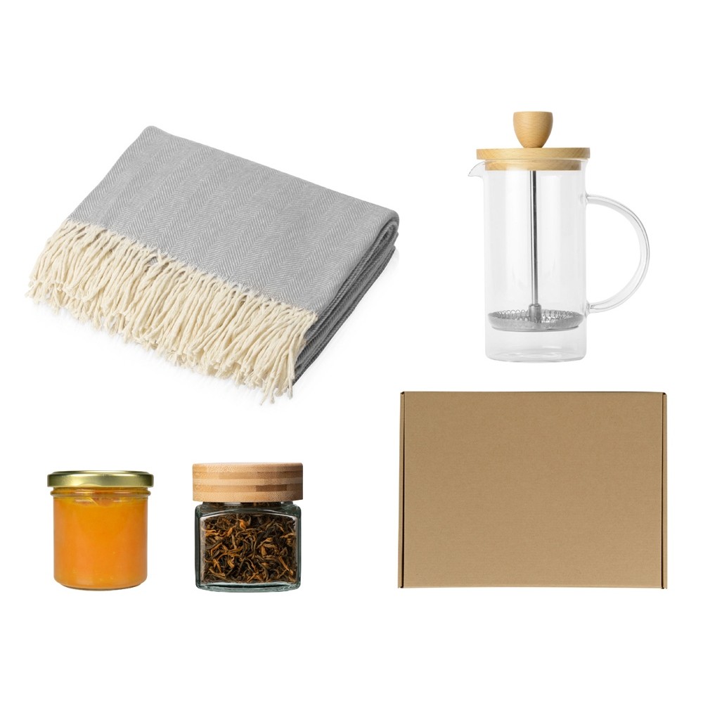 • Подарочный набор с пледом, френчпрессом, чаем и вареньем, серый