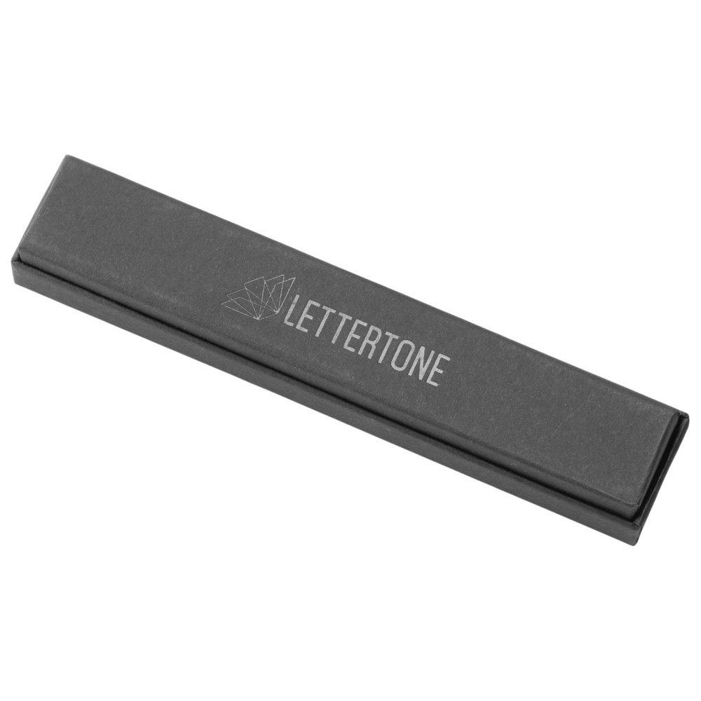 Ручка упакована в чёрный матовый футляр с логотипом бренда Lettertone на дне.