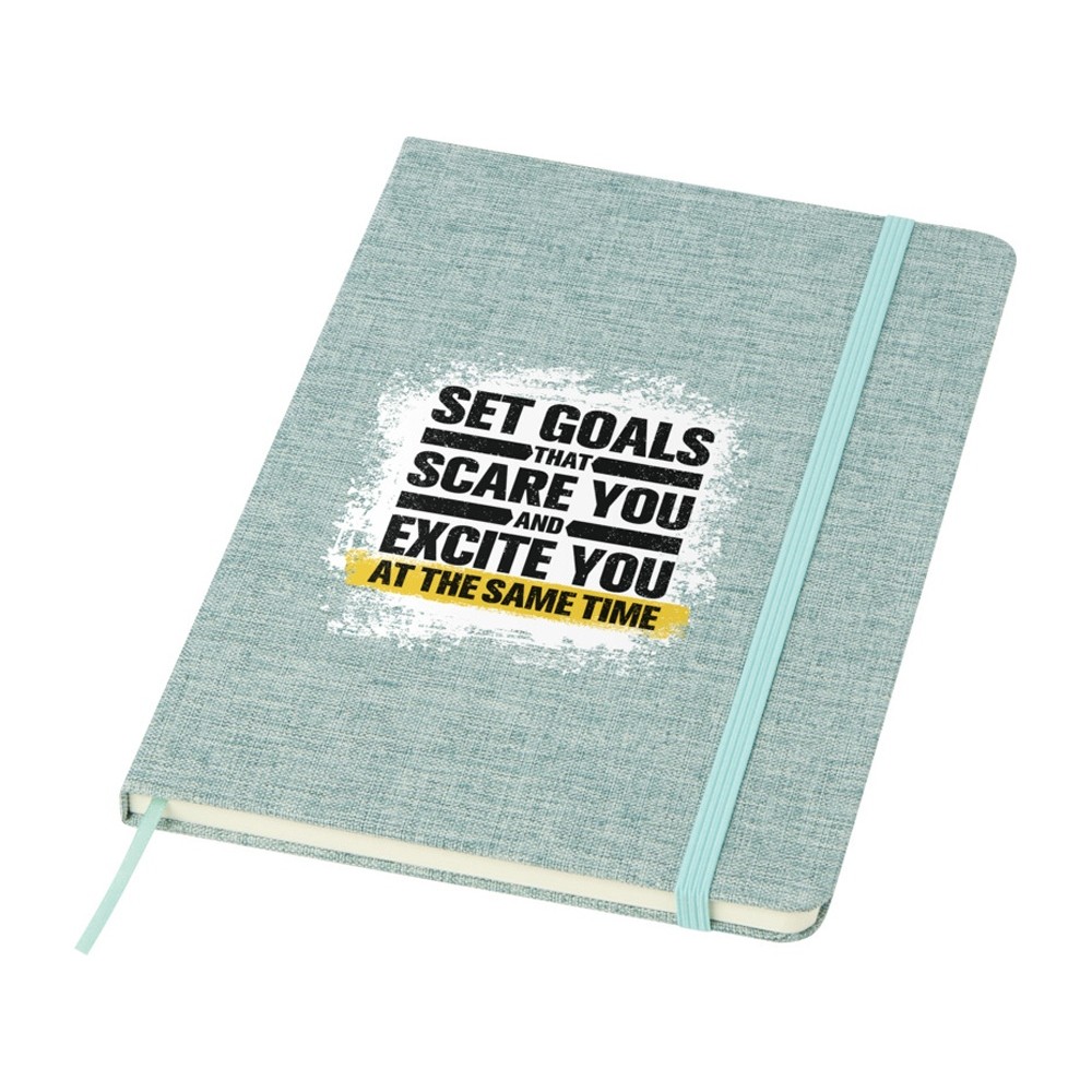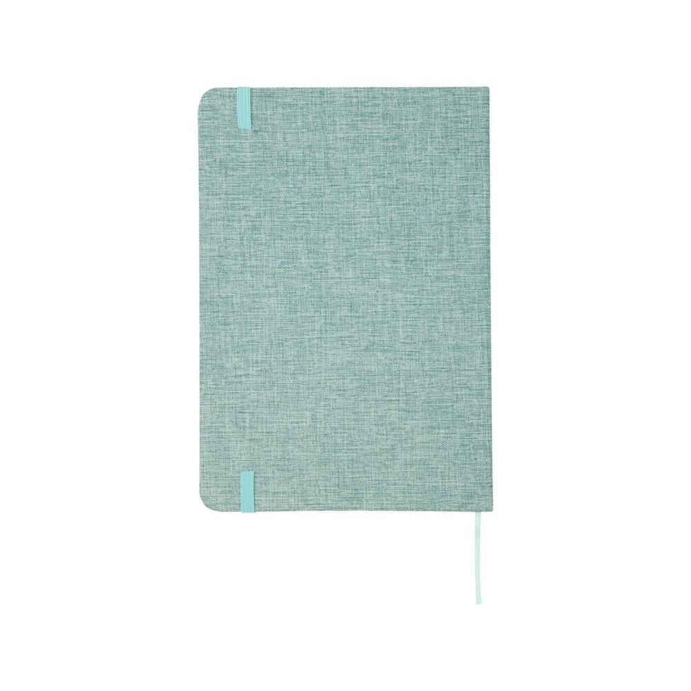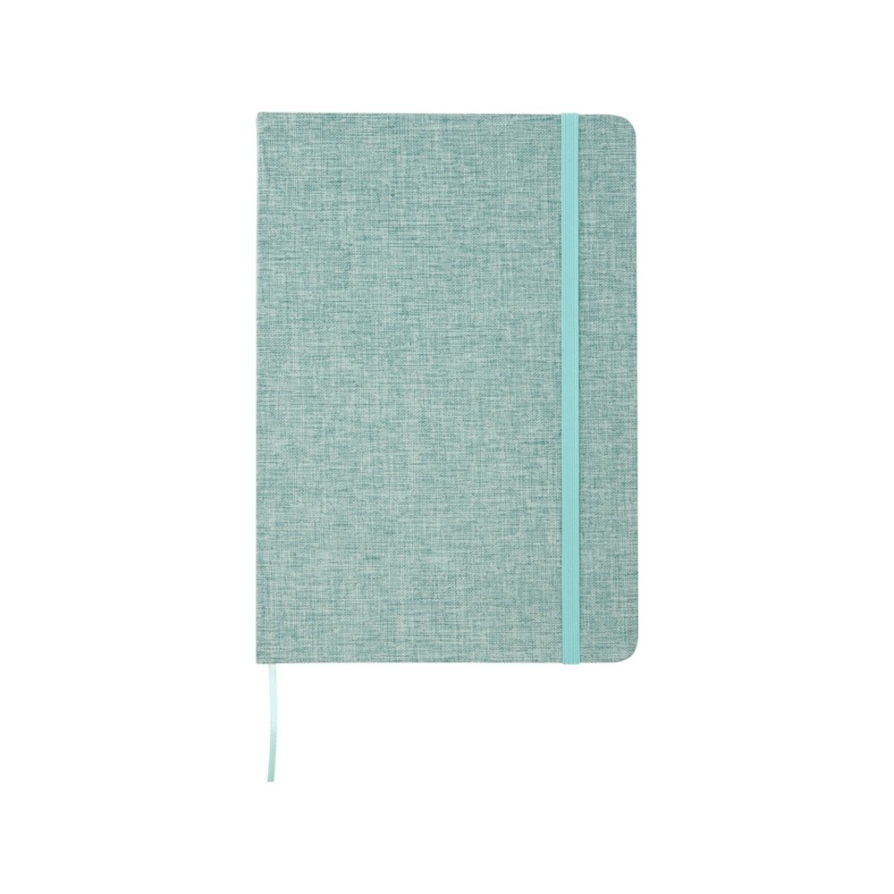 Блокнот формата А5 в твердой обложке из переработанного хлопка, 80 листов бумаги плотностью 70 г/м² в линейку. Блокнот имеет эластичную застежку, ленту и закругленные углы. FSC certified paper. FSC Mix Credit P7.1 CU-COC-877277.