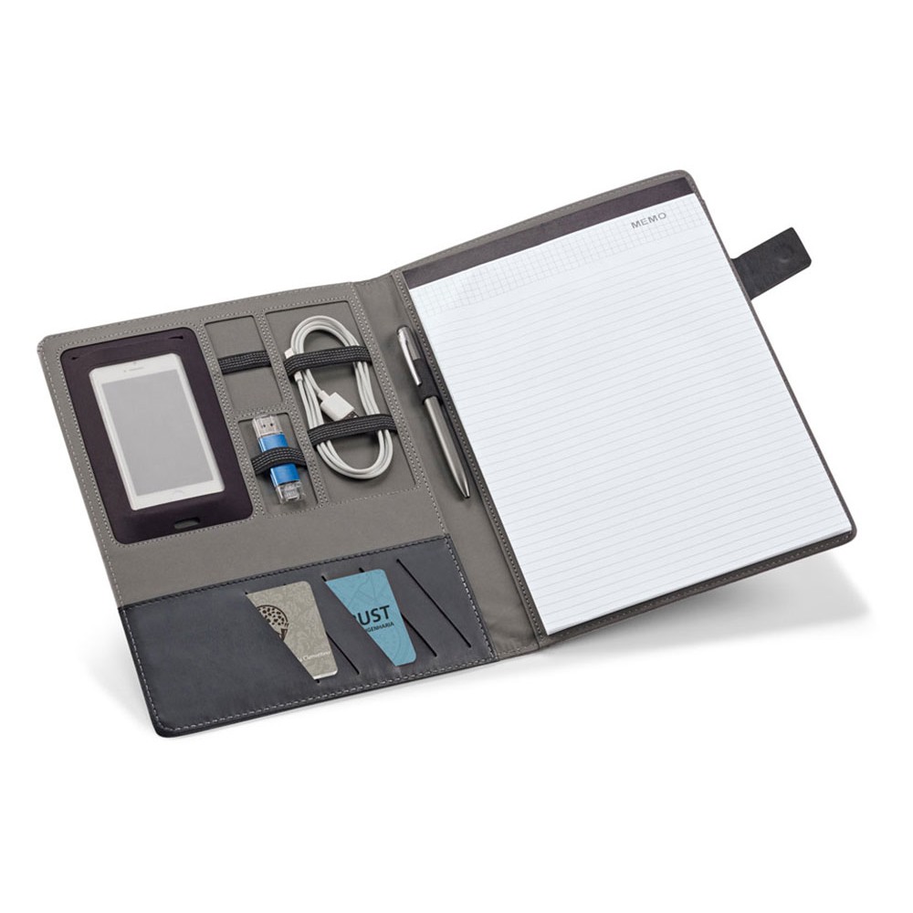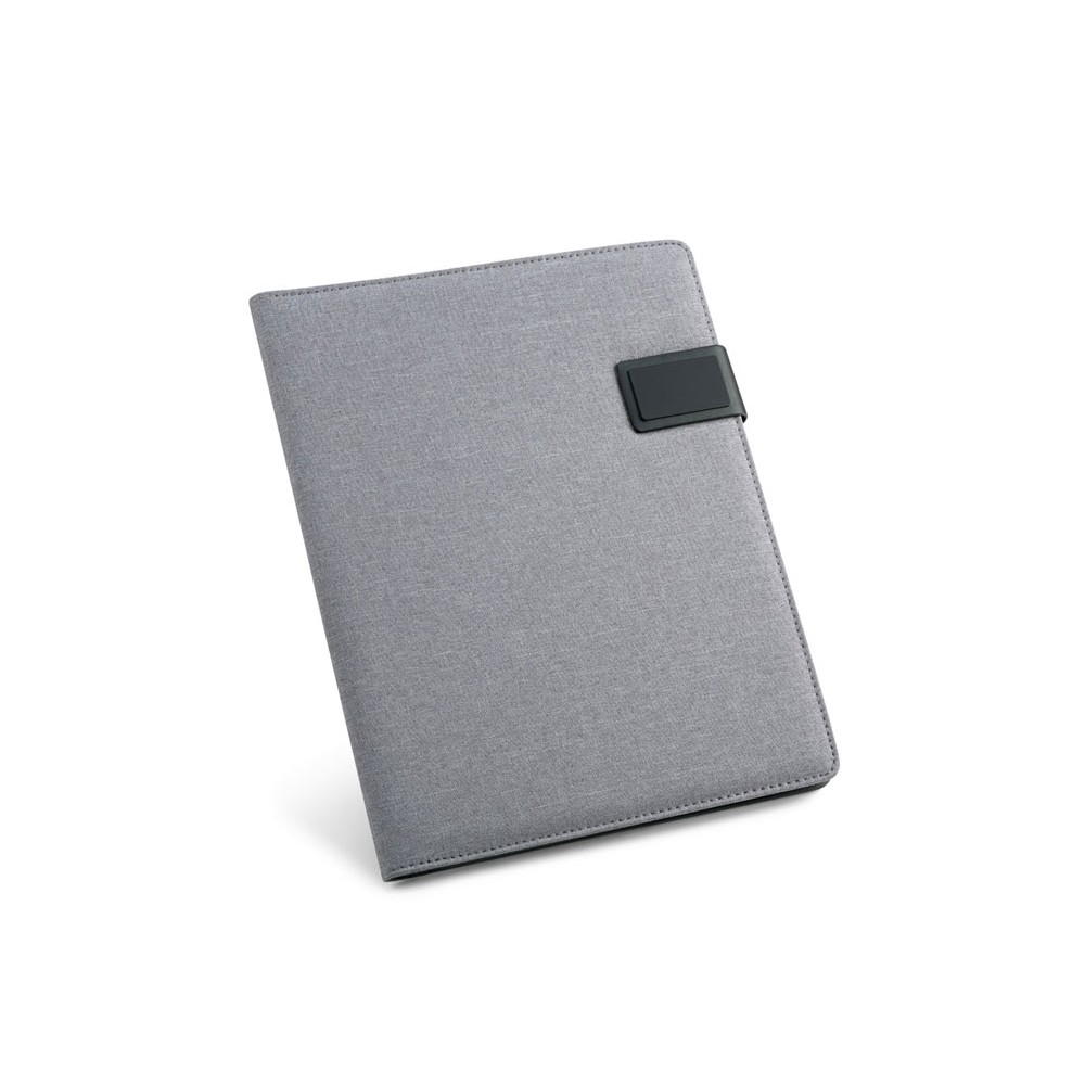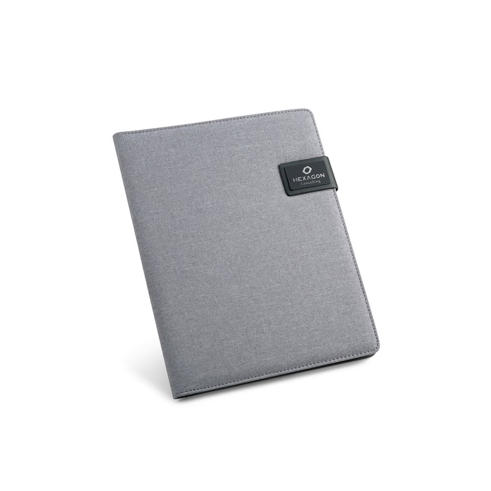 Папка A4 из искусственного льна и кожзаменителя. Имеет застежку на магните с пластинкой для персонализации. Внутри имеет блокнот из 20 листов в линейку, держатель для шариковой ручки (ручка не входит в комплект), карман для смартфона и держатели для кабелей или других принадлежностей (в комплект не входят). 233 x 310 x 18 мм | Пластина: 50 x 30 мм. Вид нанесения, рекомендуемый поставщиком: трансфер, гравировка.