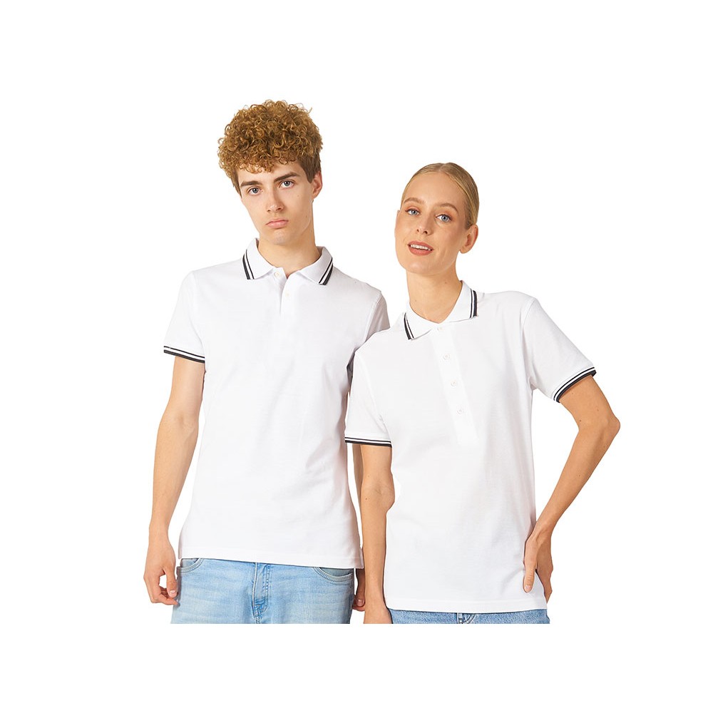 Рубашка-поло Erie с окантовкой. Воротник и манжеты резинка 1х1. Мужская модель с двумя пуговицами, женская - 4 пуговицы в тон изделия. Обшивка внутри воротника. Женская модель с разрезами по бокам. Женская модель приталена. Пике, 100% чесаный хлопок. Плотность 180 г/м2.