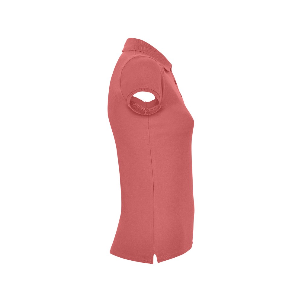 Поло с коротким рукавом для женщин приталенного силуэта. Воротник и манжеты из риба 1х1, отделка горловины внутри тесьмой. Элегантная планка застегивается на 3 пуговицы. Разрезы в боковых швах.