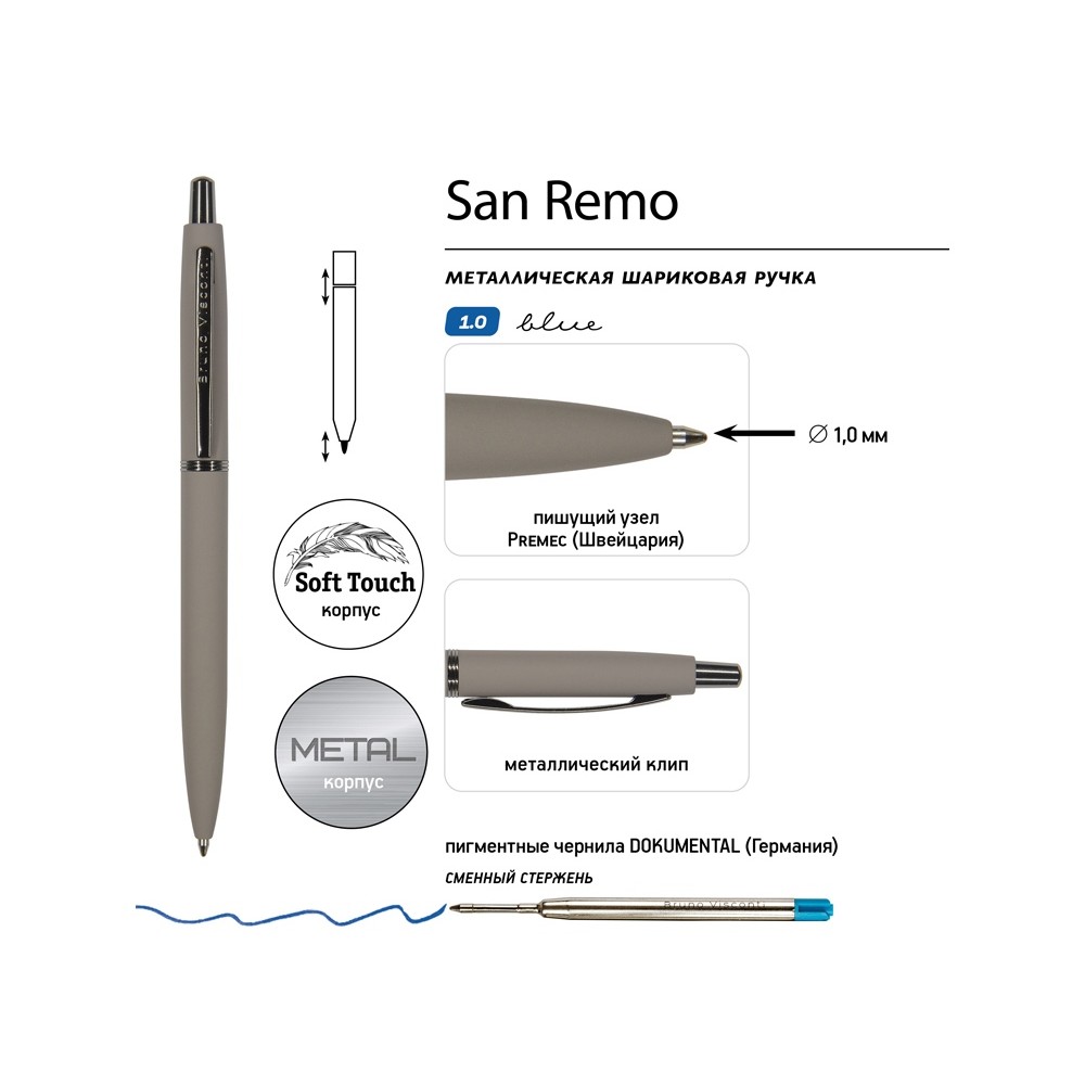Металлическая шариковая ручка «San Remo» - аксессуар, призванный стать настоящим элементом стиля, подчеркнуть индивидуальность его владельца.