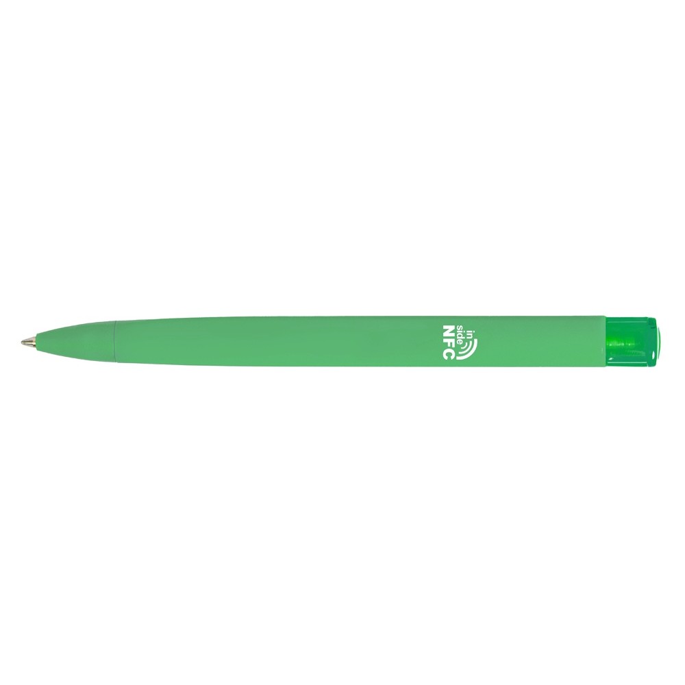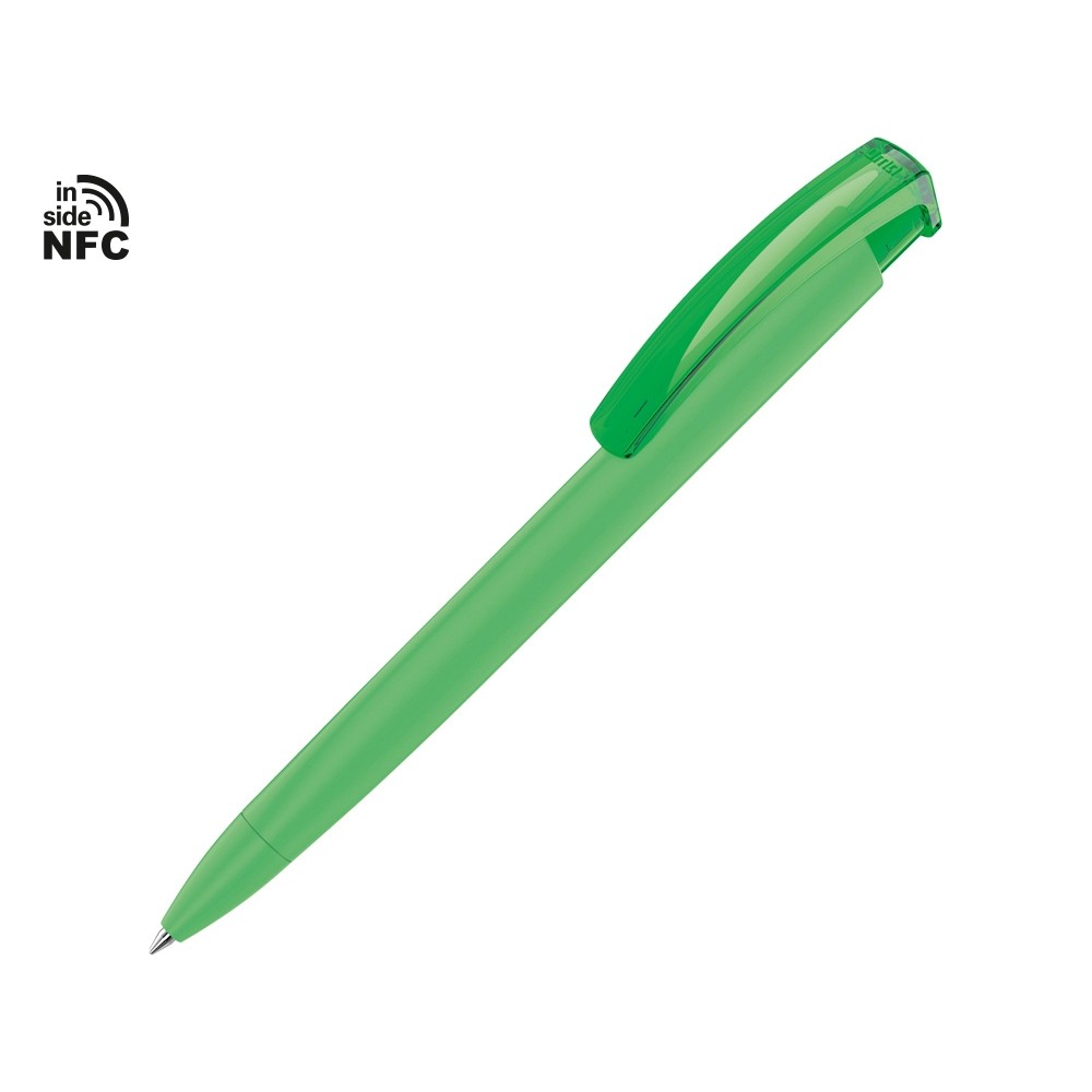 Пластиковая шариковая ручка «Trinity K transparent Gum» soft-touch» с чипом передачи информации NFC обеспечивает быстрый доступ к рекламной информации. Для передачи данных посредством технологии NFC смартфон или планшет, которые поддерживают данную технологию, необходимо поднести к запрограммированной на ручке метке NFC (метка расположена под логотипом NFC). После этого на смартфоне или планшете откроется запрограммированная ссылка на сайт, ролик или начнется загрузка другой информации (заранее загруженной в сеть интернет). Таким образом метка работает как код, при чтении которого смартфон или планшет открывает определенную программу, активирует функцию или ссылку. Можно запрограммировать на метке NFC адрес сайта, каталог и другие рекламные материалы и раздавать вместо визиток. Метка NFC активирует одно действие на смартфоне или планшете.