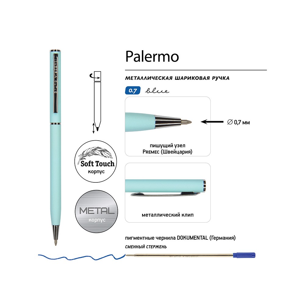 Технические характеристики Ручка шариковая автоматическая BrunoVisconti® "PALERMO" цвет корпуса голубой, soft-touch, 0.7 мм