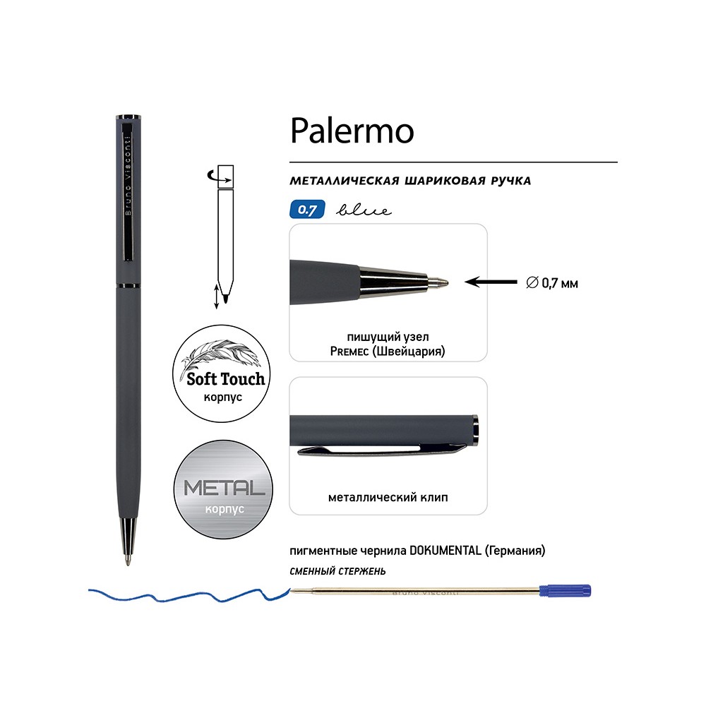 Технические характеристики Ручка шариковая автоматическая BrunoVisconti® "PALERMO" цвет корпуса графитовый, soft-touch, 0.7 мм