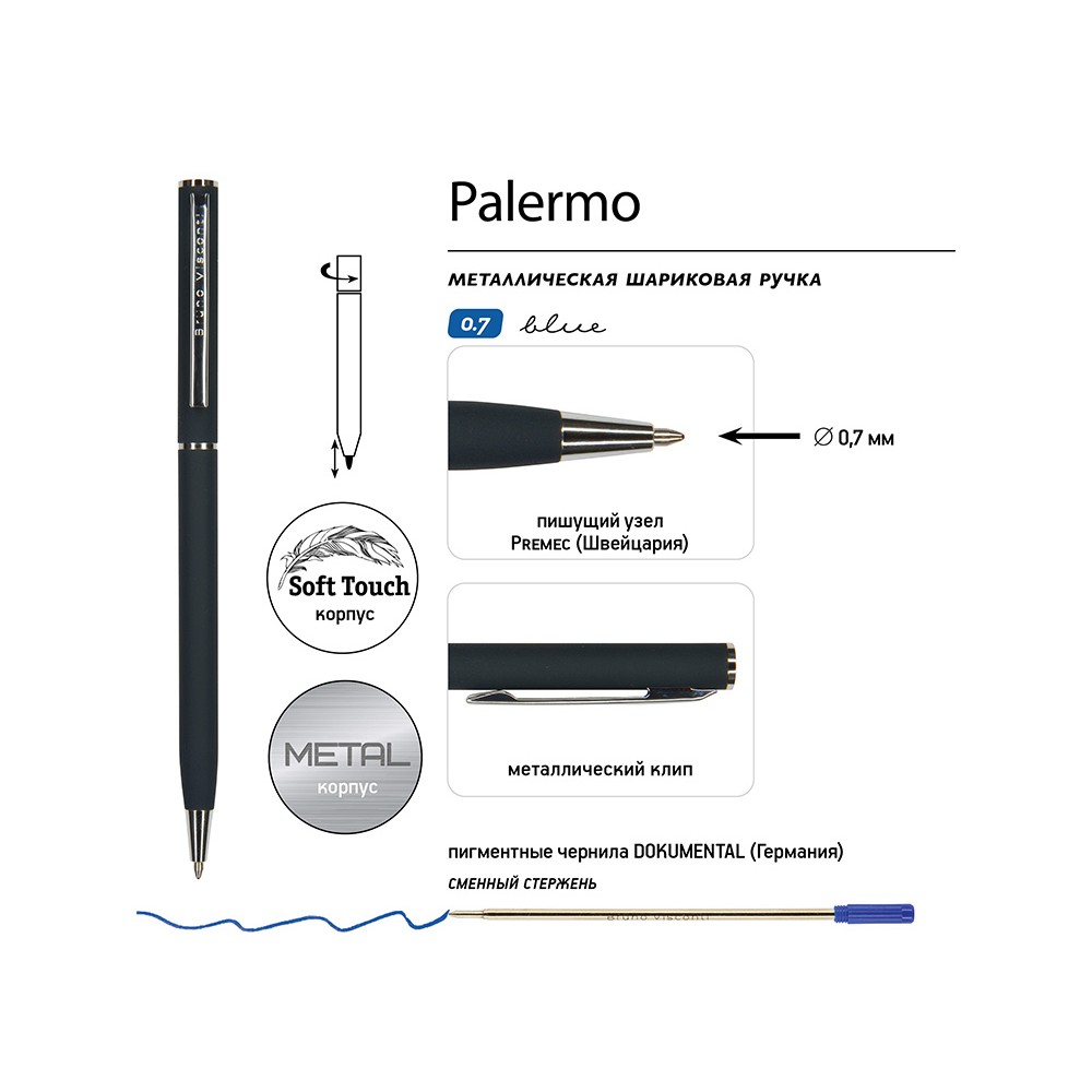 Технические характеристики Ручка шариковая автоматическая BrunoVisconti® "PALERMO" цвет корпуса сине-черный, soft-touch, 0.7 мм