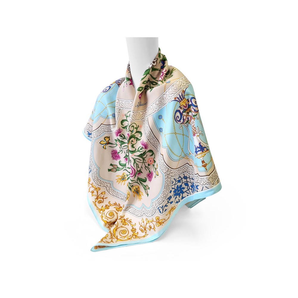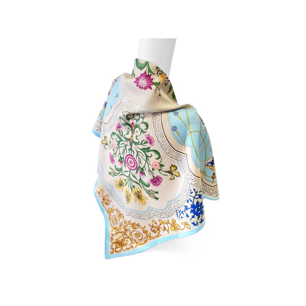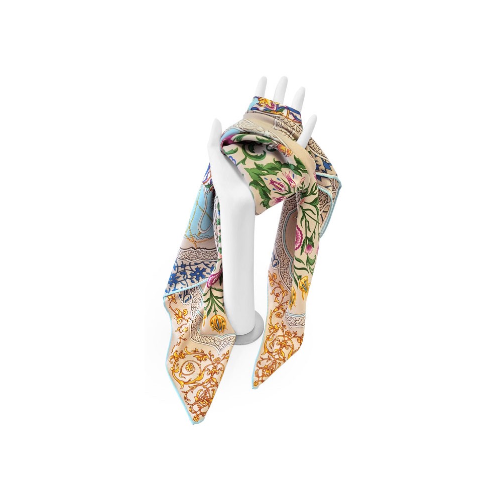 Принт аксессуара образуют знаменитые орнаменты востока — гирих (бесконечный “узел”) и ислими (“путь в божественный сад”). Непрерывные витиеватые линии в сочетании с узорами из гибких стеблей с зеленой листвой и пестрыми соцветиями завораживают, погружают в состояние медитации, постижения тайны мироздания через призму счастья и красоты.