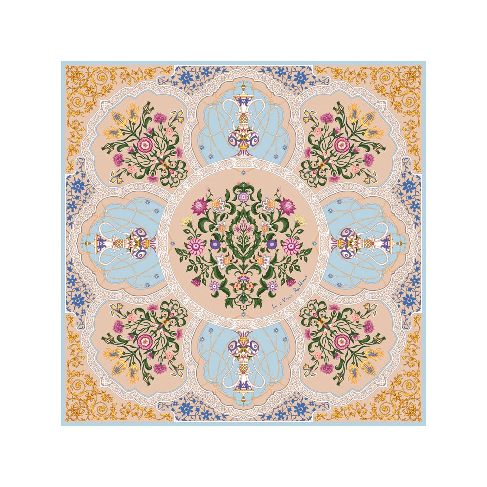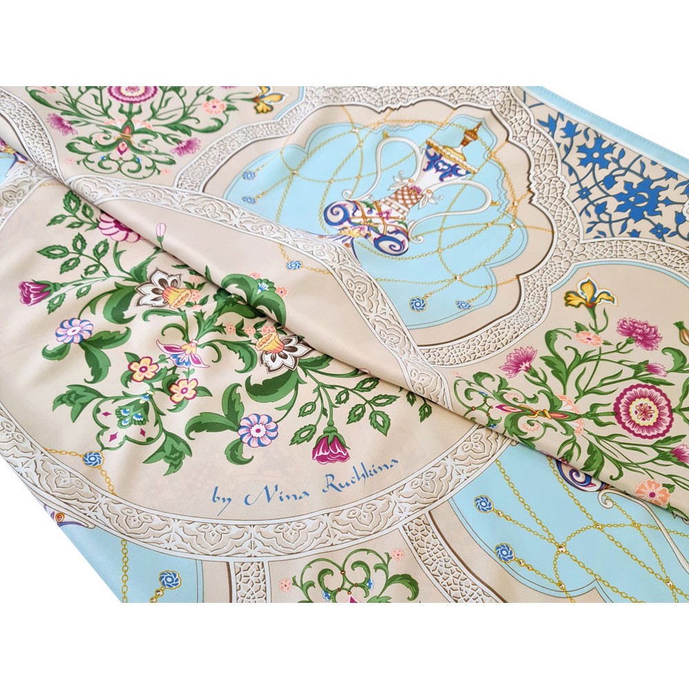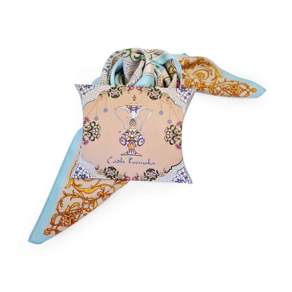 Платок “Сады Востока” от бренда “Русские в моде” by Nina Ruchkina посвящен экзотической красоте, женской привлекательности и очарованию. В центре полотна расположились цветы дивного сада, олицетворяющие собой процветание, мир и земную любовь. Рядом изображены кувшины, наполненные росой молодости и секретами вечно цветущих восточных красавиц.