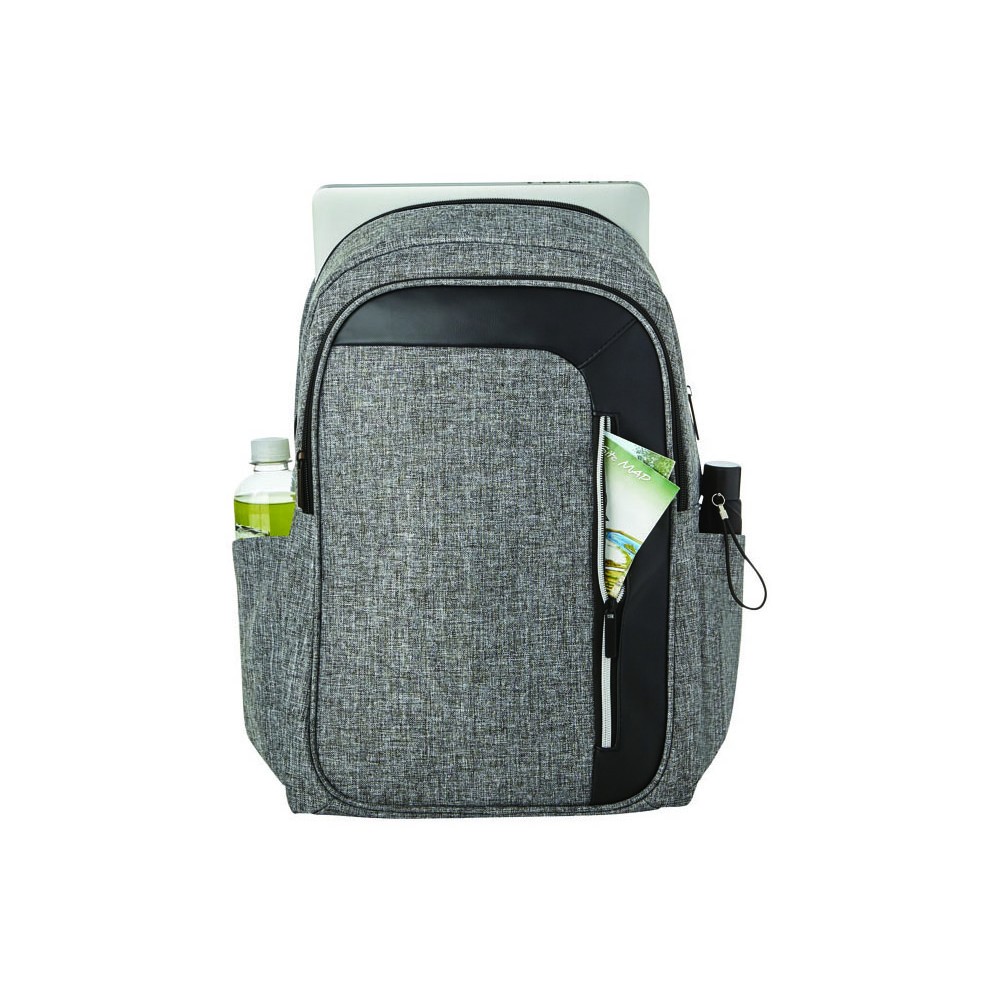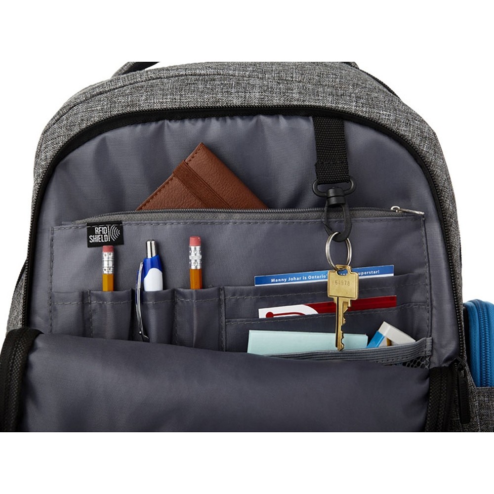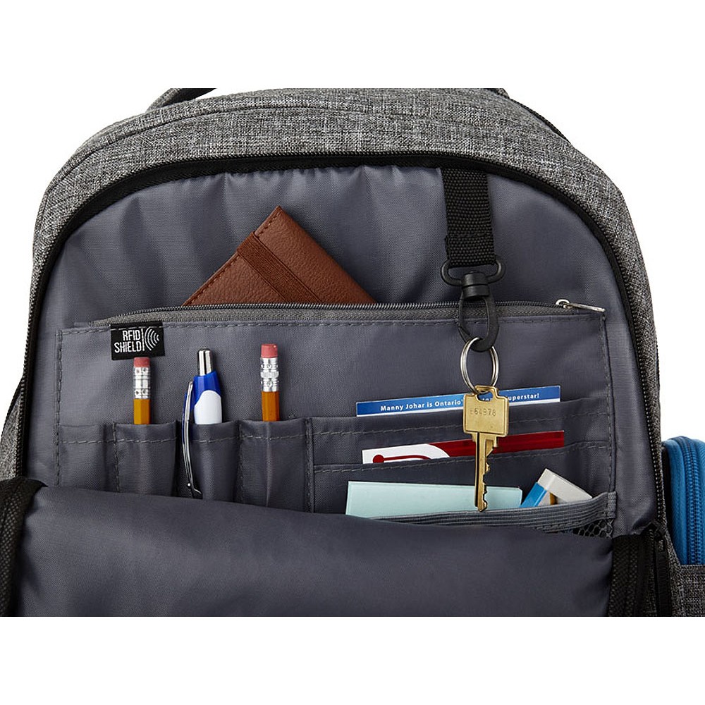 Рюкзак Vault для ноутбука 15.6" с защитой RFID. Изящный, современный рюкзак для ноутбука 15,6 " с большим передним карманом на молнии с карабином для ключей, и скрытым карманом с защитой RFID, чтобы защитить ваши карточки и паспорт от кражи личных данных. Большое основное отделение вмещает ноутбук 15,6" и специальный карман для IPad или планшета. Плотная спинка. Передняя вертикальная молния разработана, чтобы дать вам быстрый доступ к переднему карману. 2 дополнительных боковых кармана для большего места, регулируемые, мягкие ремни рюкзака позволят прикрепить к ним дополнительные аксессуары. Ручка вверху и стропа для крепления к чемодану. 600D полиэстер с акцентами из ПУ винила.