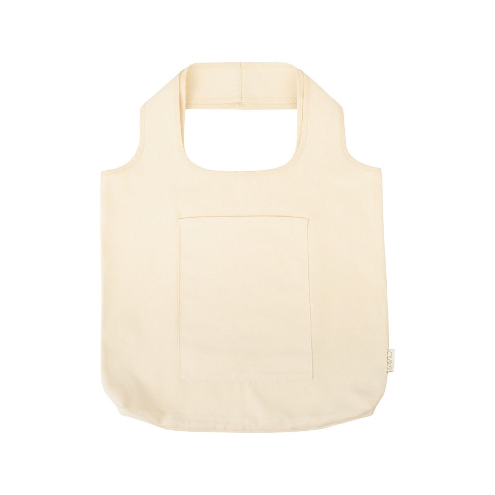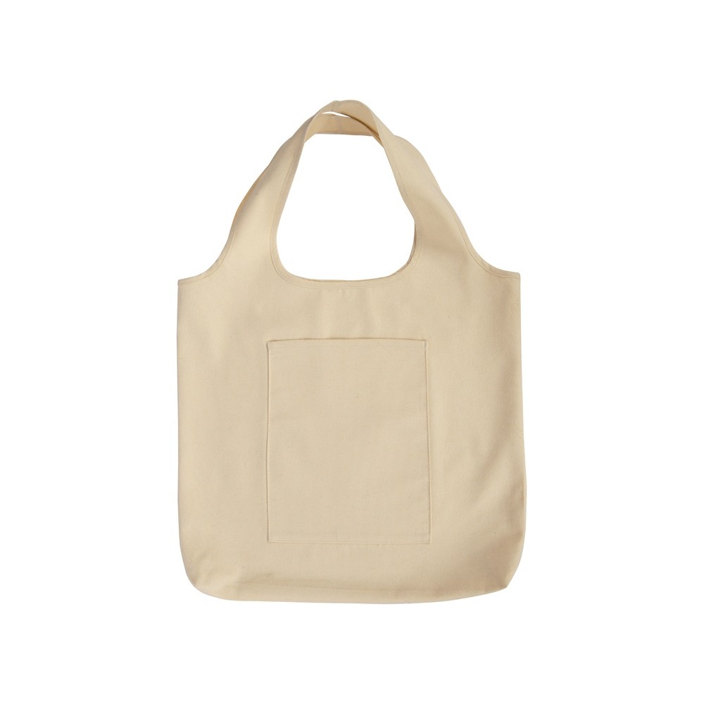 Вместительная сумка-шоппер из очень плотного переработанного хлопка с широкими лямками и большим наружным карманом 20 x 25 см спереди.