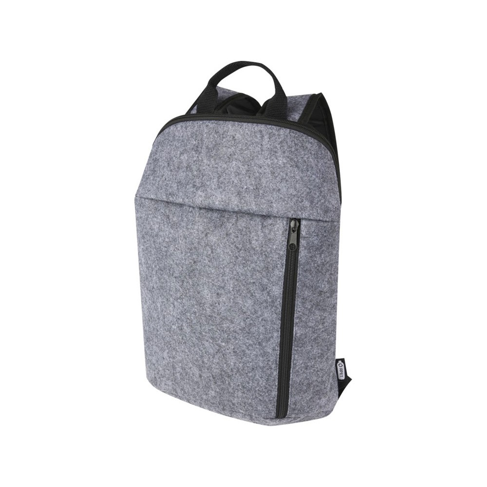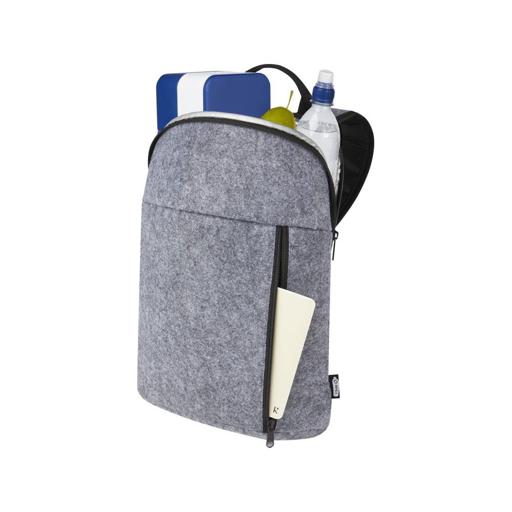 Практичный рюкзак-холодильник, изготовленный из высококачественного мягкого и прочного фетра, переработанного по стандарту GRS. Имеет основное отделение на молнии, отделанное высокоплотной термической PEVA-изоляцией, совместимой с пищевыми продуктами, позволяющей хранить напитки и закуски холодными на протяжении нескольких часов. Передний карман на молнии. Регулируемые наплечные ремни из хлопка и тканая ручка для переноски. Легко чистится. Емкость: 7 литров.