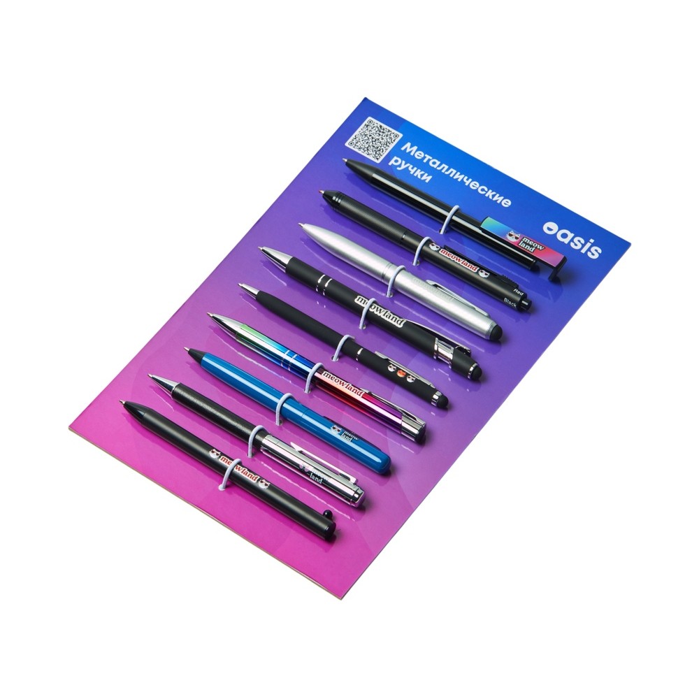 Промо-сет ручек — ваш готовый демонстрационный комплект, включающий 9 моделей металлических ручек с примерами нанесения: гравировка, тампопечать и УФ-печать.