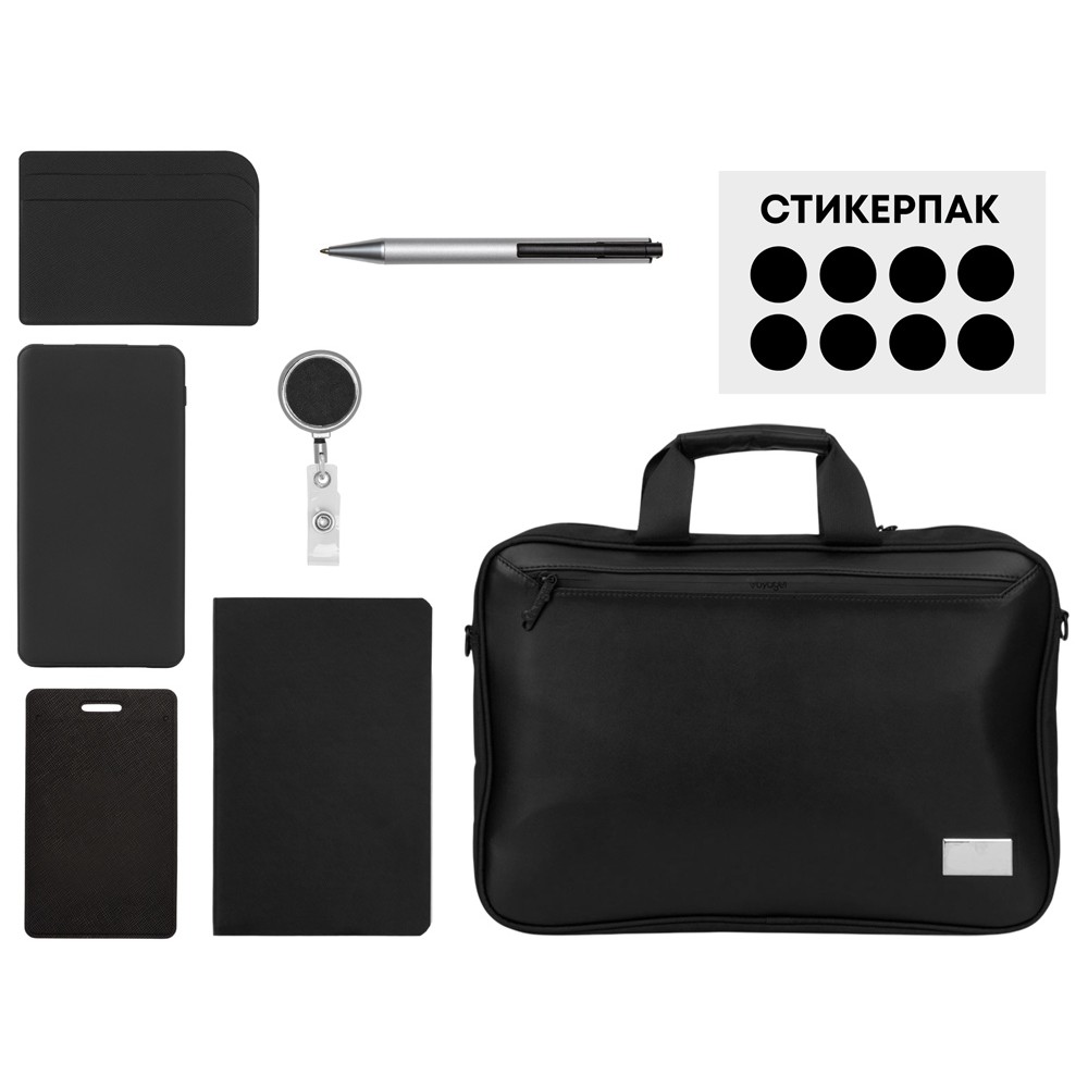 Комплект необходимых офисных предметов также включён в набор: ретрактор, чехол для пропуска, блокнот А6 на 80 листов, металлическая шариковая ручка, картхолдер для пластиковых карт.