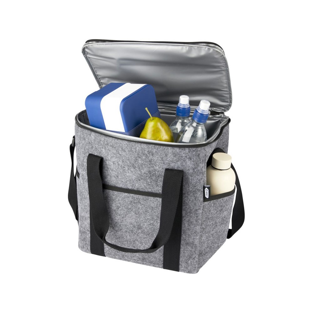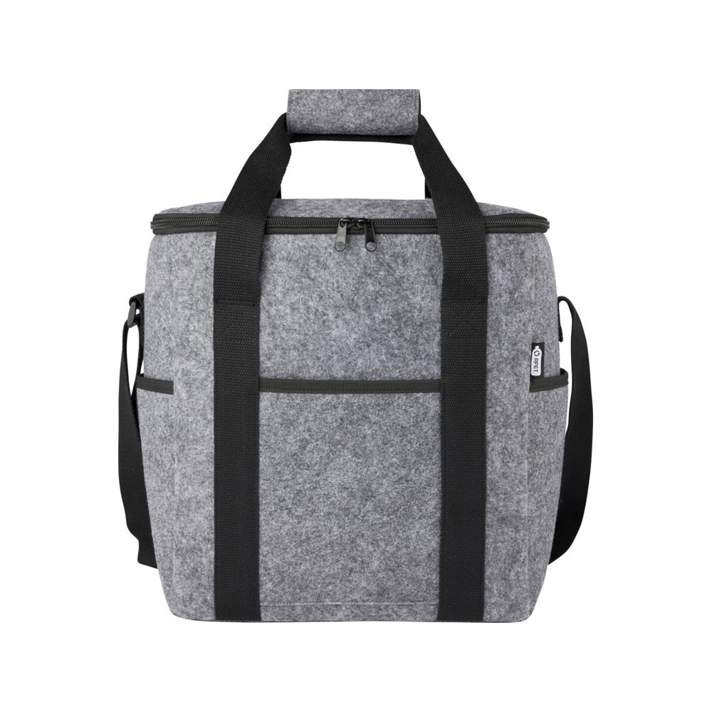 Большая сумка-холодильник, изготовленная из высококачественного мягкого и прочного фетра, переработанного по стандарту GRS. Имеет большое главное отделение (на шесть бутылок 1,5 л), отделанное высокоплотной термической PEVA-изоляцией, совместимой с пищевыми продуктами, позволяющей хранить напитки и закуски холодными на протяжении нескольких часов. Верхняя часть с застежкой на молнии, передний карман и два боковых кармана для дополнительной вместимости. Длинные регулируемые тканые плечевые ремни из хлопка (55 x 3,8 см) и 2 тканых хлопковых ручки для переноски (25 x 3,8 см) с верхней застежкой на липучке. Легко чистится. Емкость: 21 литр.