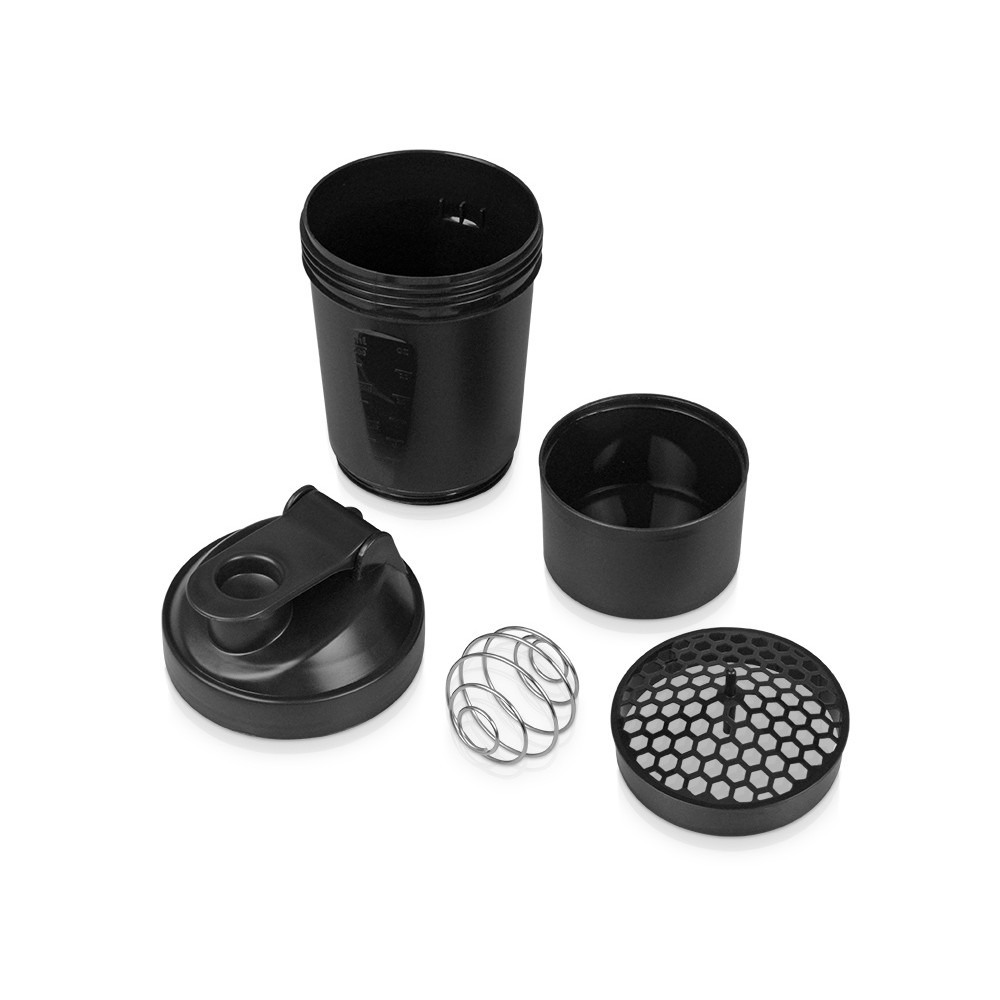 Шейкер для спортивного питания - это один из необходимых аксессуаров для спортсменов и людей, ведущих активный образ жизни. В нем можно приготовить протеиновый коктейль или фруктовый напиток. Шейкер классической формы, он удобно лежит в руке, к донышку прикручивается емкость для смешивания (таблетница), в которой можно хранить спортивные добавки: протеиновый порошок, витамины и другие концентраты. Внутри колбы имеется пластиковая сетка, чтобы процеживать спортивный напиток, а также металлический размешиватель, который растворяет порошок в напитке без комочков. Объем - 400мл. Шейкер изготовлен из пищевого пластика, он герметичен и легко моется.