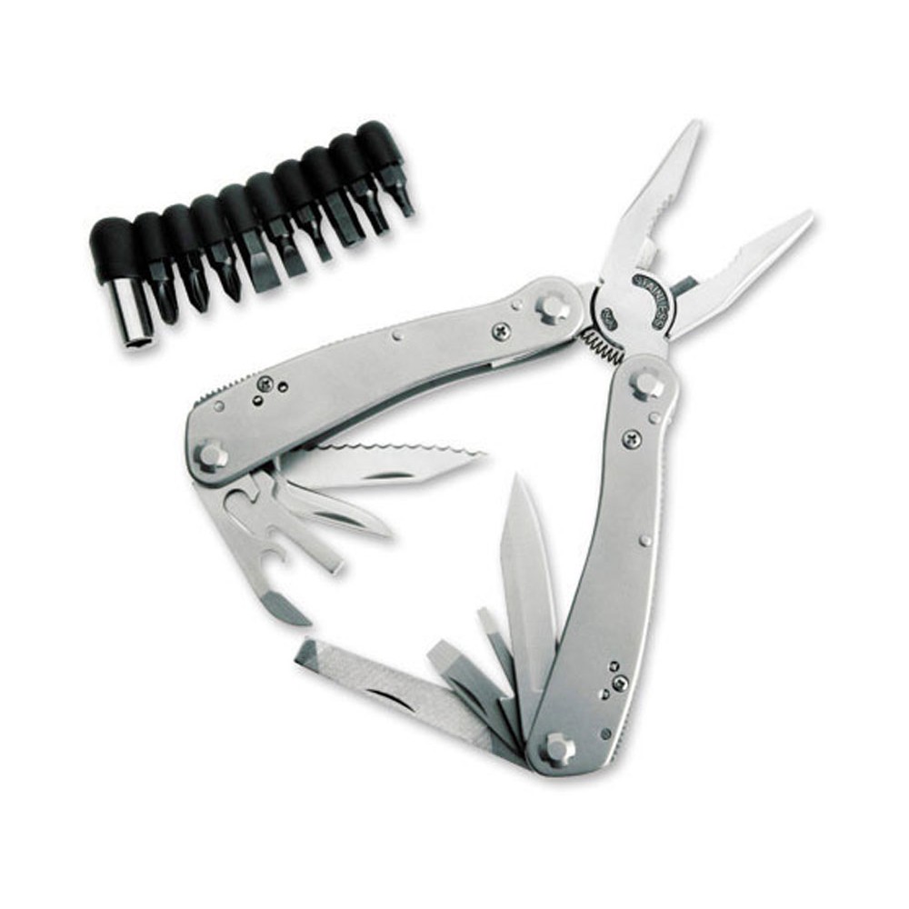 Мультитул Stinger, 105x50 мм, 16 функций, сталь, серебристый, 10 насадок и нейлоновый чехол