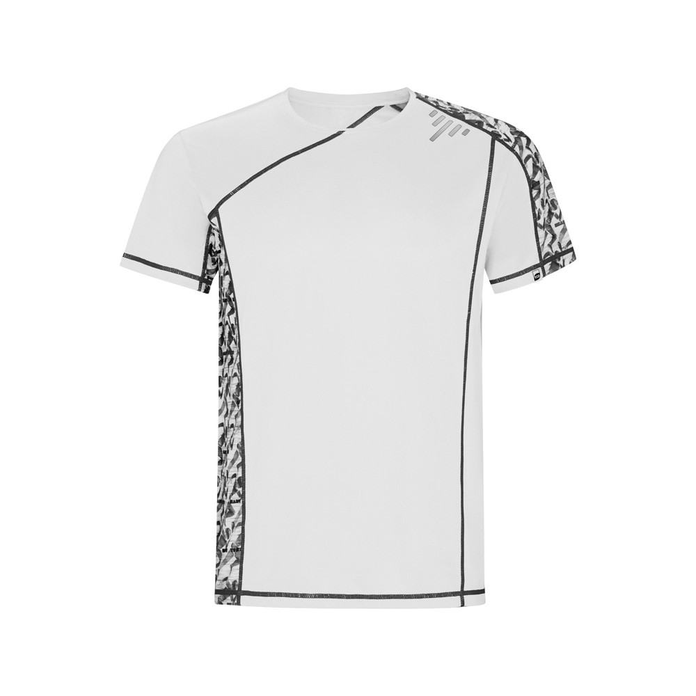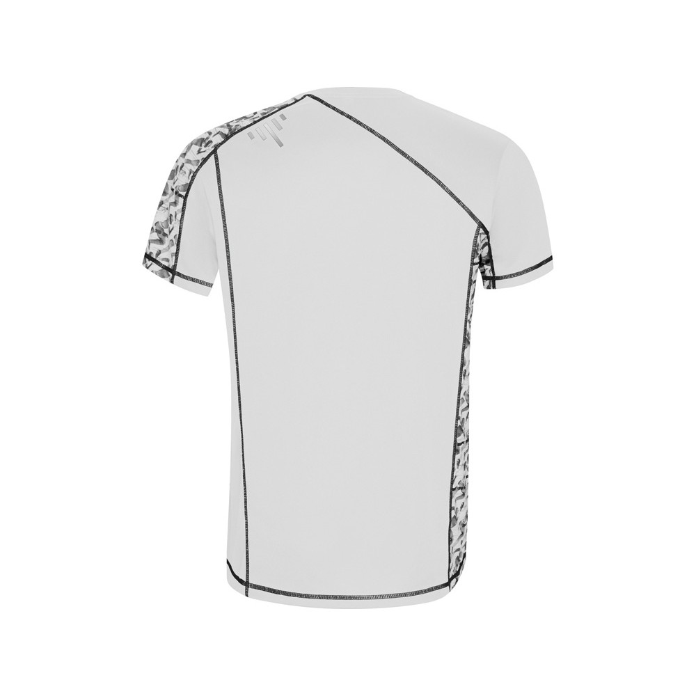 Спортивная футболка с коротким рукавом и принтованными вставками. Контрастные отстрочки плоским швом, светоотражающие элементы на полочке и спинке. Эко лейбл на рукаве.