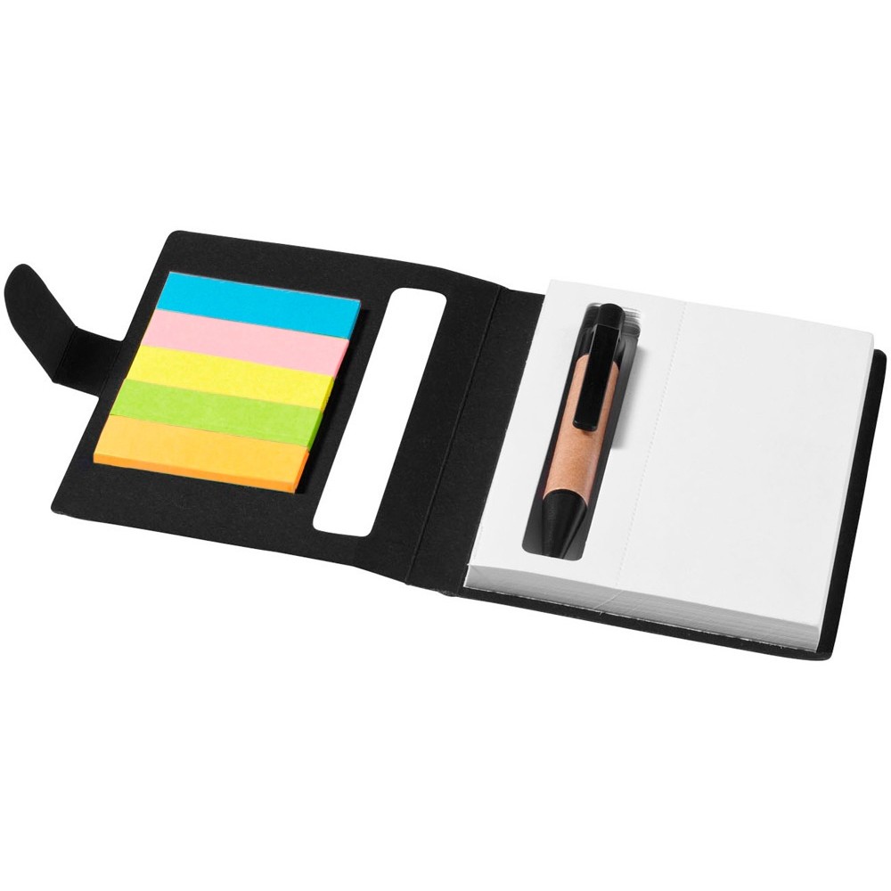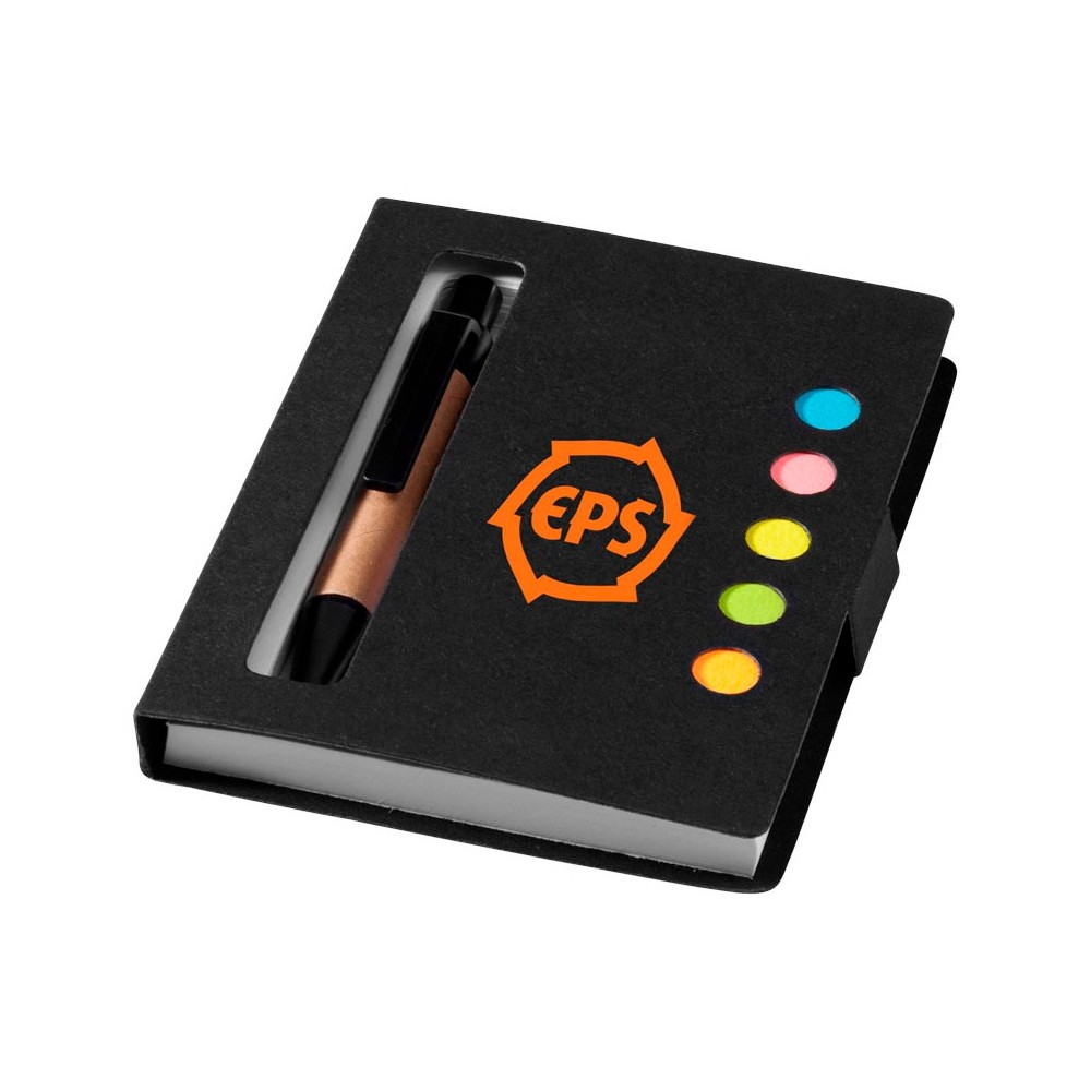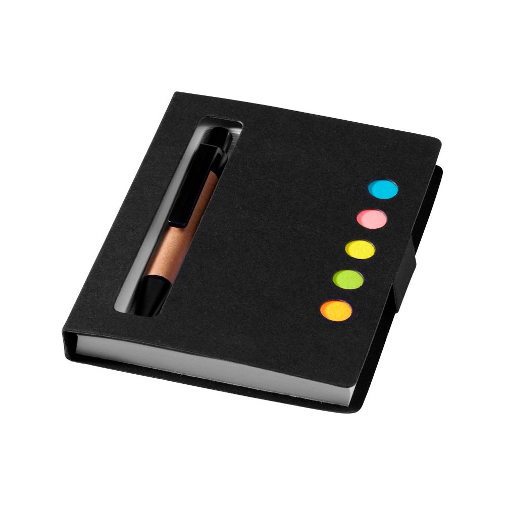 Набор цветных стикеров с шариковой ручкой и блоком из 80 белых отрывных листков. Очень удобный и функциональный аксессуар для офиса, а также отличный промо-сувенир. На обложку из уплотненного картона возможно нанесение логотипа вашей компании.