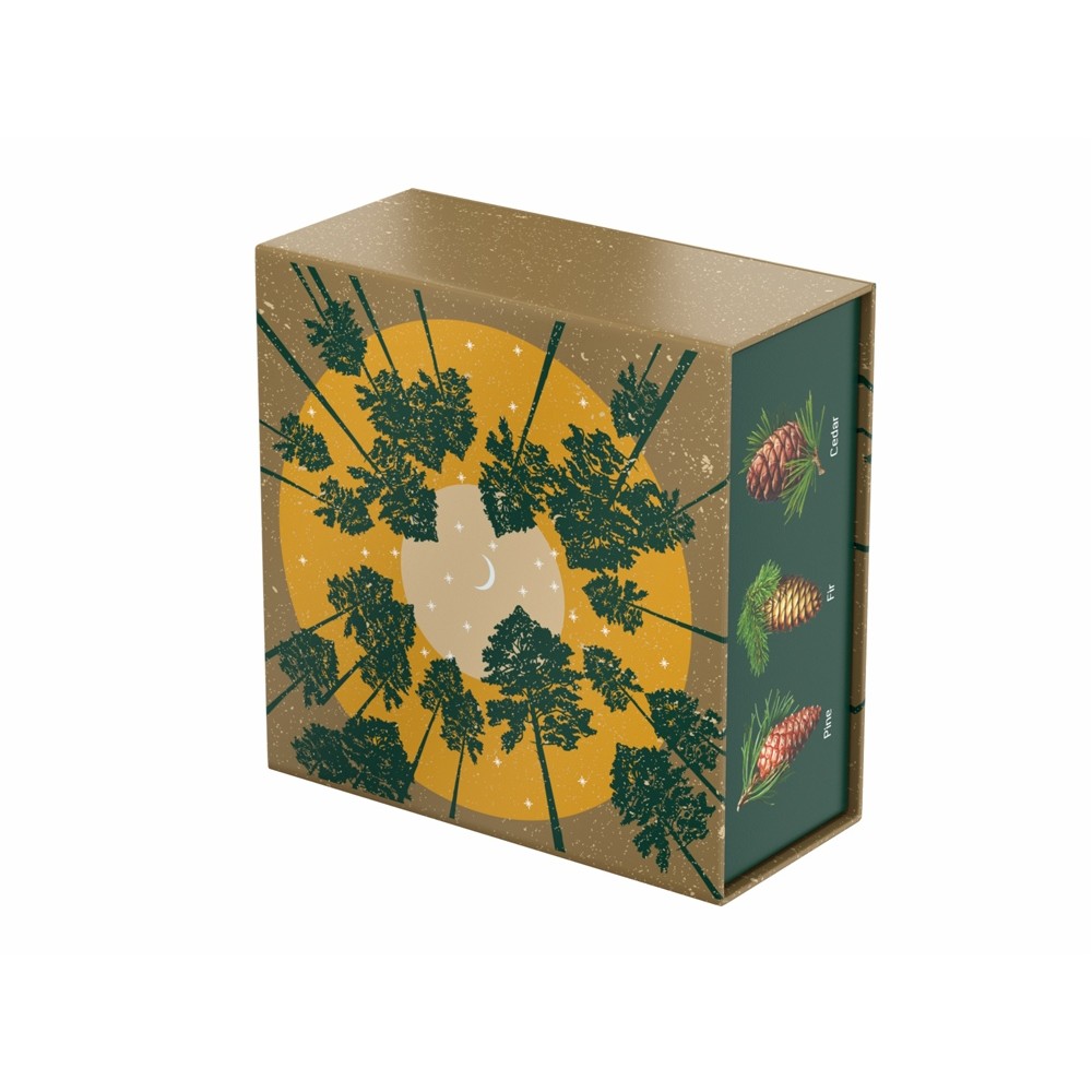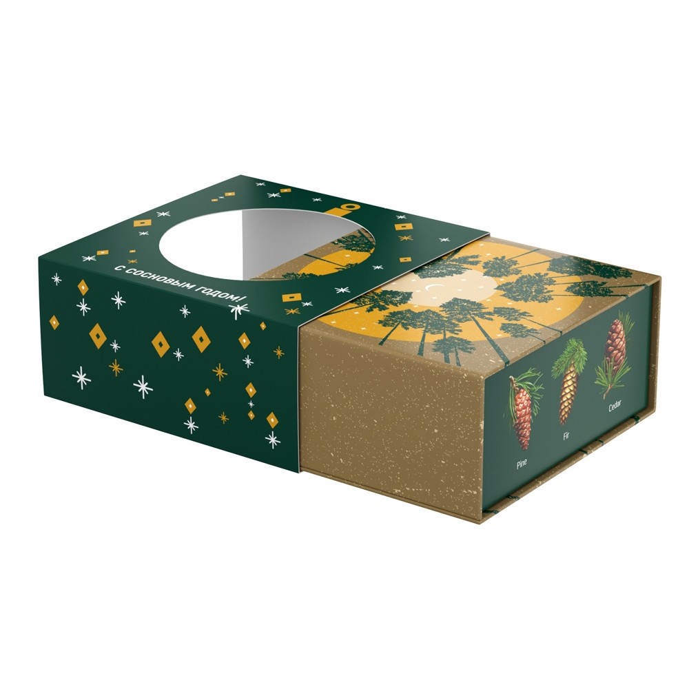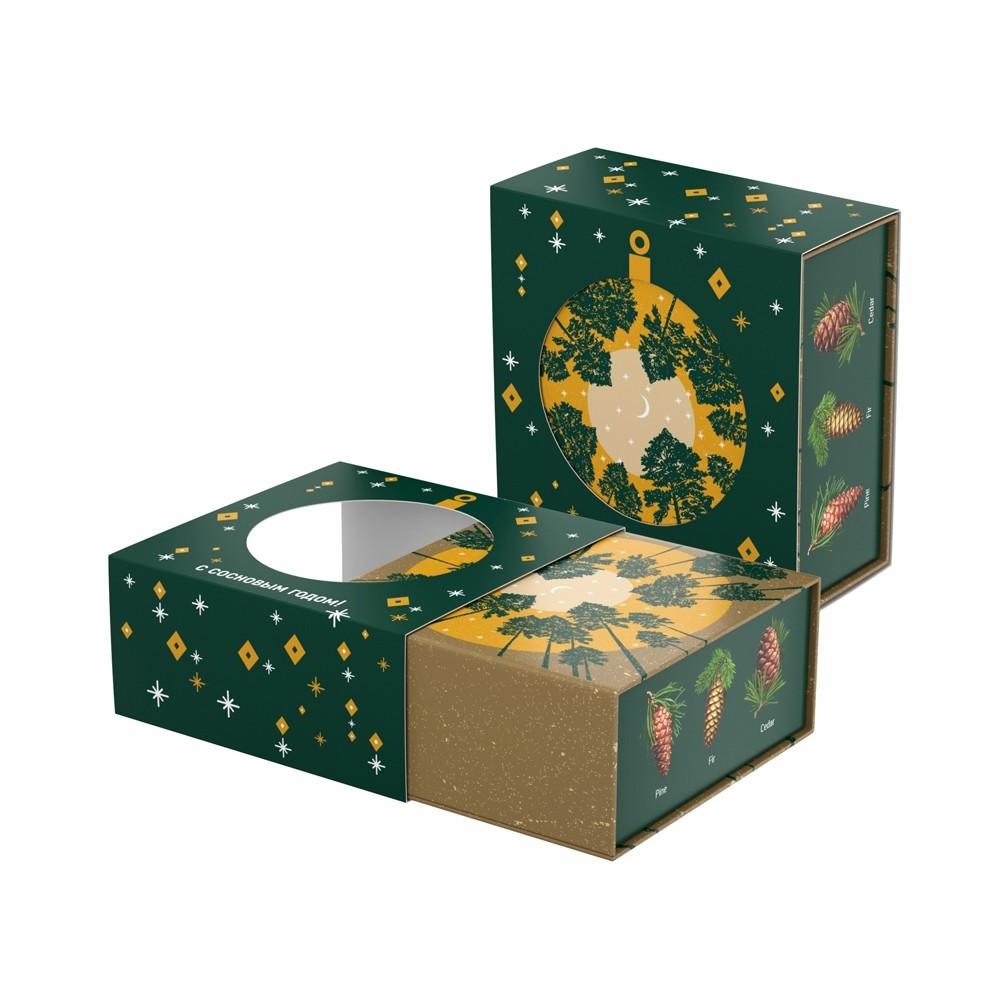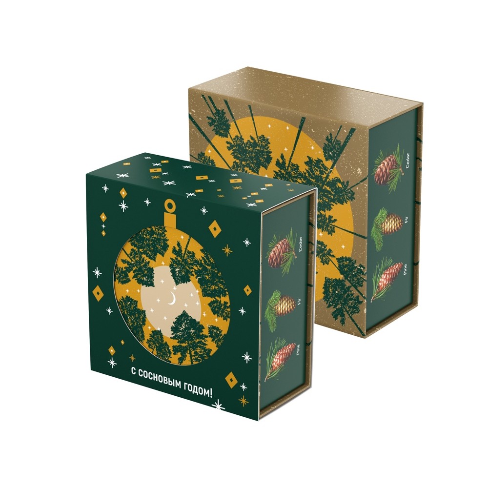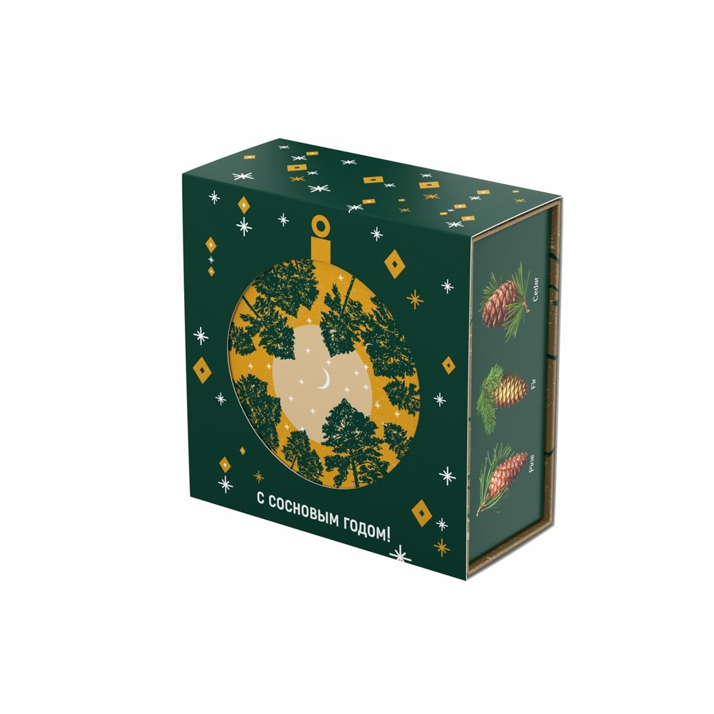 Аромат и вид хвои – символ Рождества и Нового года. «Хвойная» шкатулка «С сосновым годом!» оформлена праздничным паттерном и изображением шишек разных хвойных деревьев. На крышке шкатулки помещена иллюстрация, изображающая вид снизу вверх на звёздное небо и уходящие ввысь сосны. При надевании на шкатулку шубера (суперобложки) с круглым отверстием, на крышке шкатулки появляется вырубное изображение новогоднего шарика.
