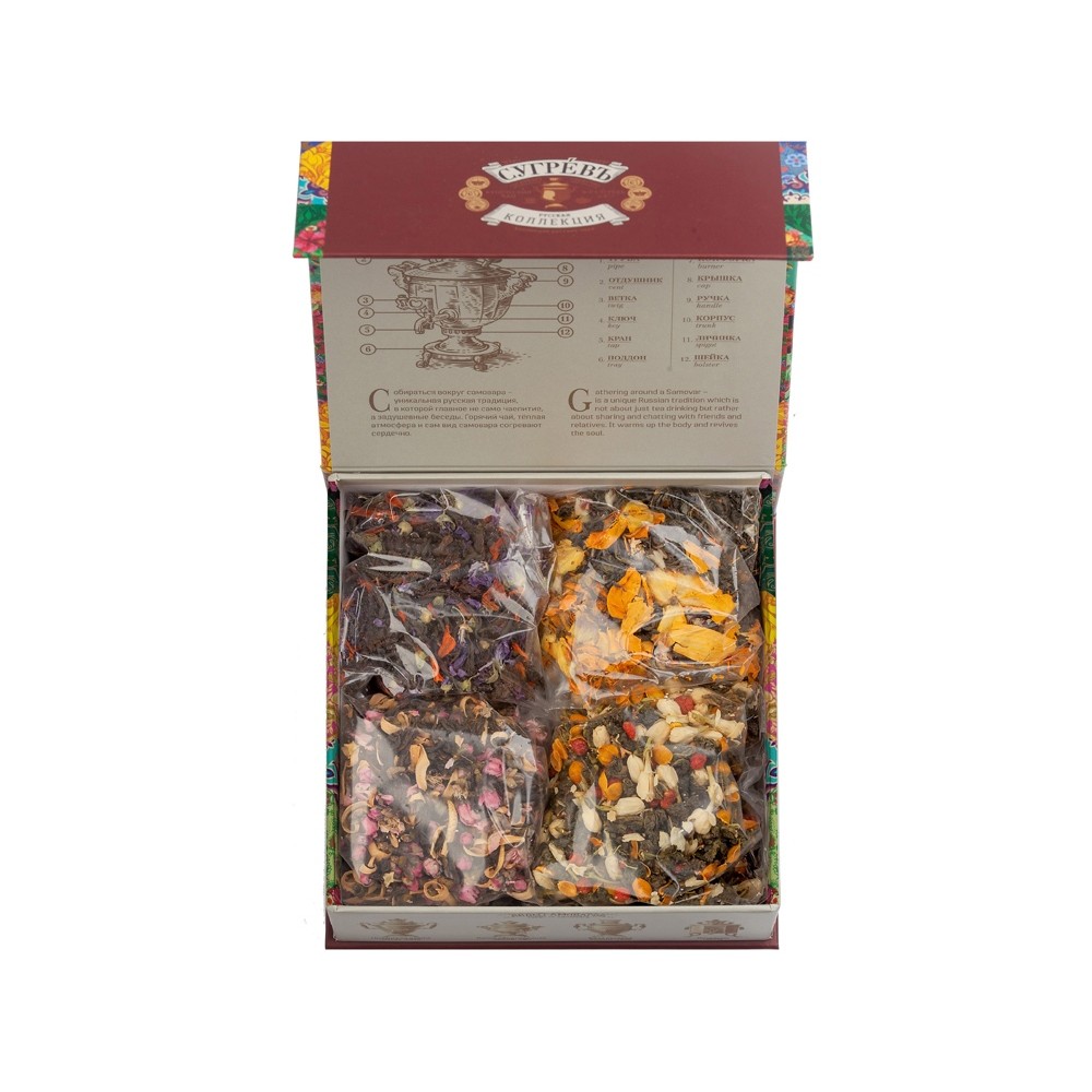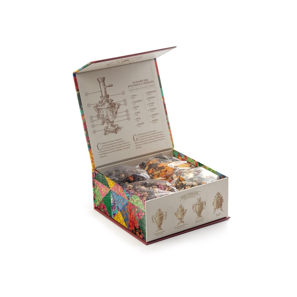 Купажи чая составлены так, чтобы сочетать вкус и аромат отборных сортов китайского и индийского чай с красотой разноцветных лепестков календулы, мальвы, цветов яблони, жасмина, акации и других. Внутри шкатулки находится мини-открытка, которую покупатель может подписать.