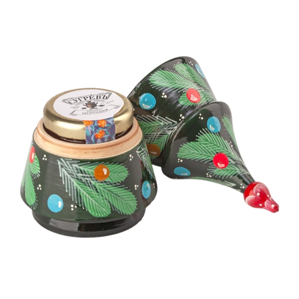 Подарочный набор из семи эксклюзивных купажей листового чая, характерных для разных регионов России и елки ручной работы с натуральным вареньем, в сувенирной шкатулке из массива берёзы.