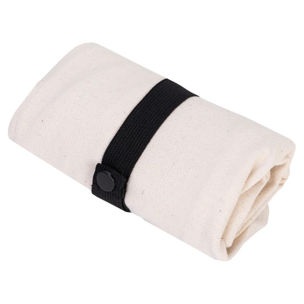 Удобная сумка-шоппер из переработанного хлопка. Можно хранить в сложенном виде и фиксировать с помощью эластичной ленты, застегивающейся на кнопку.