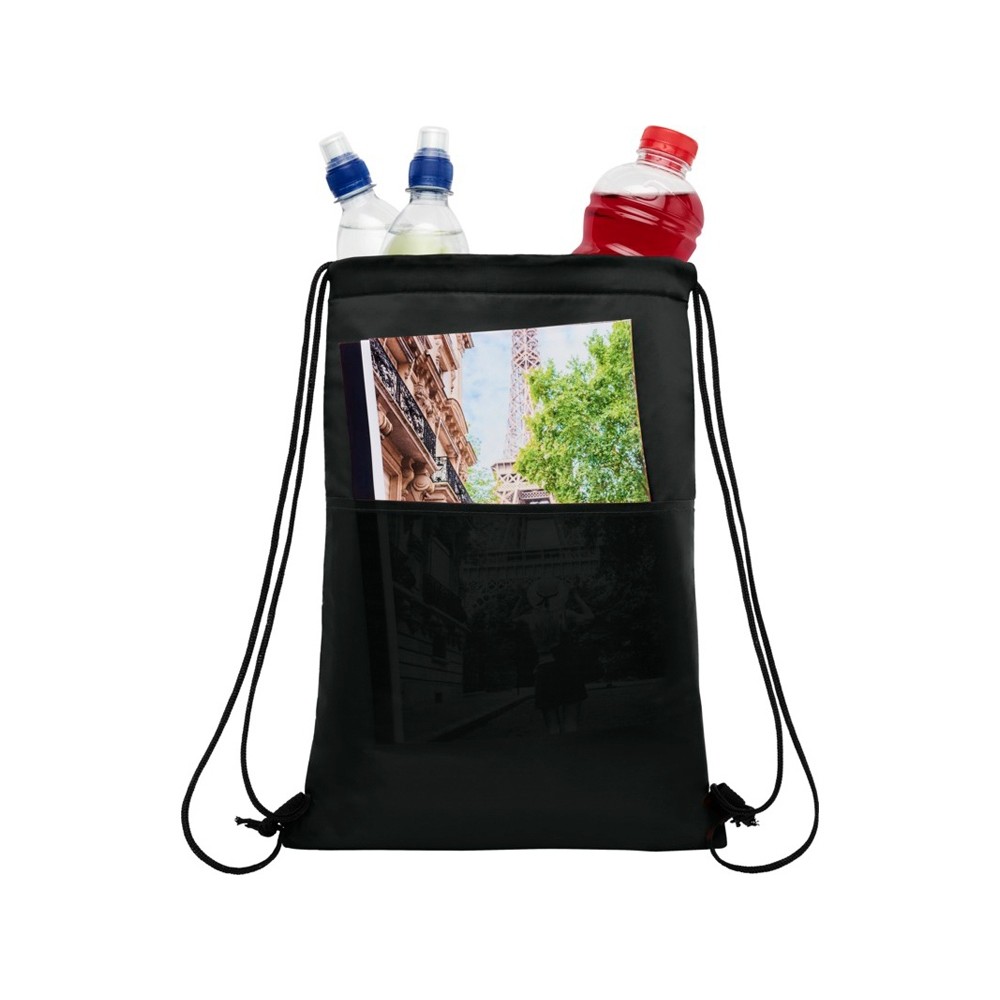 Сумка-холодильник затягивается на шнурок черного цвета. С открытым передним карманом. Вмещает 12 банок. Прочность до 5 кг.