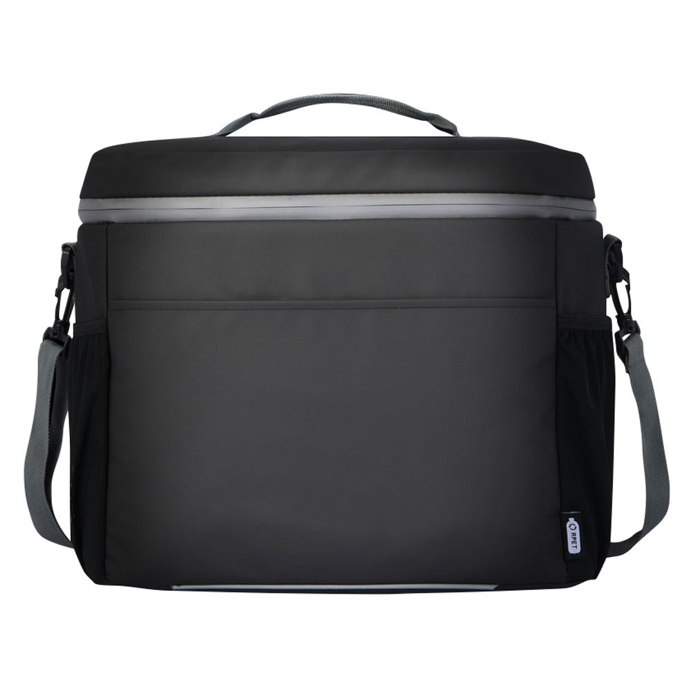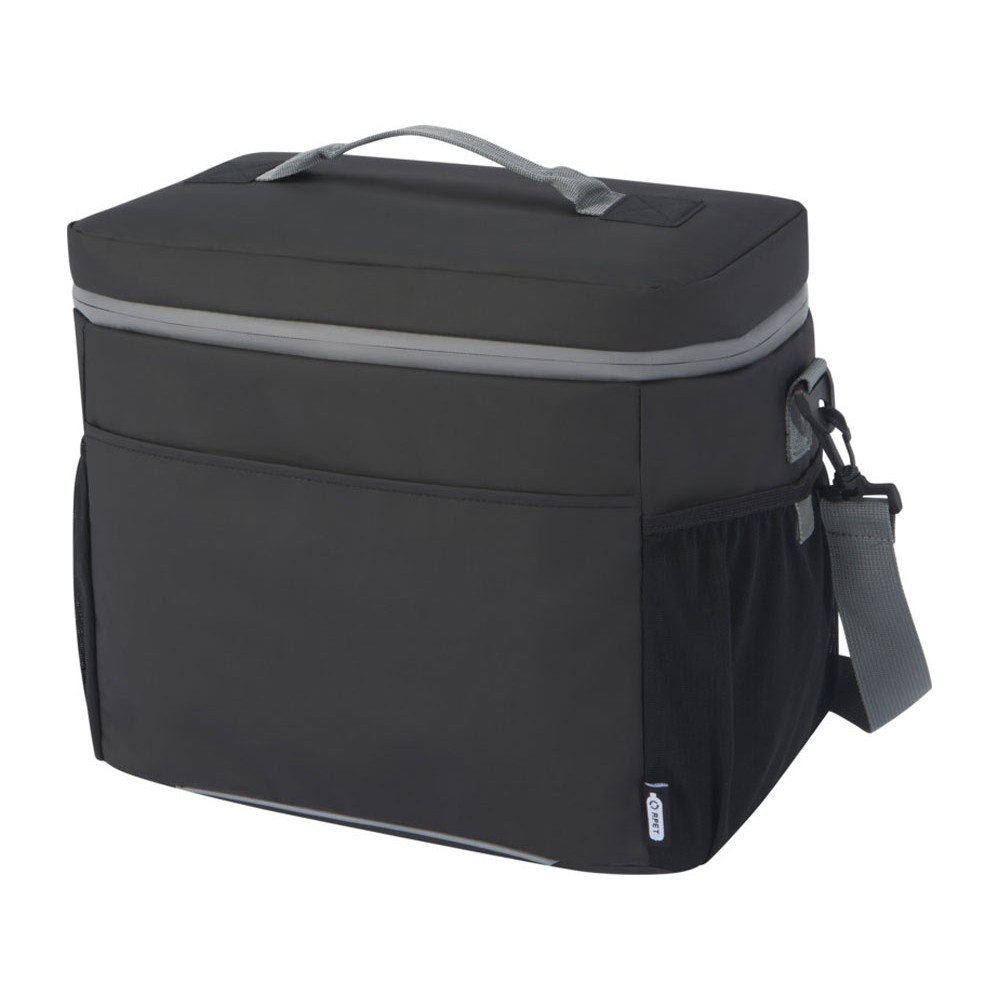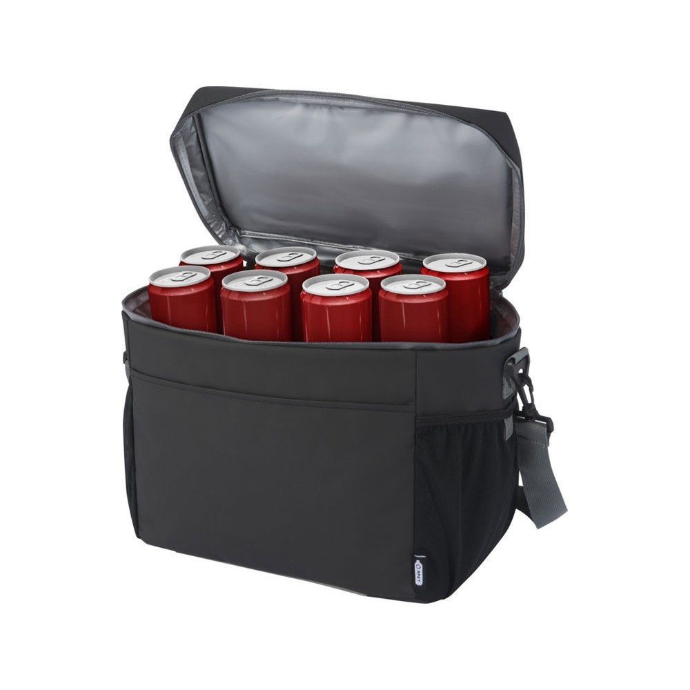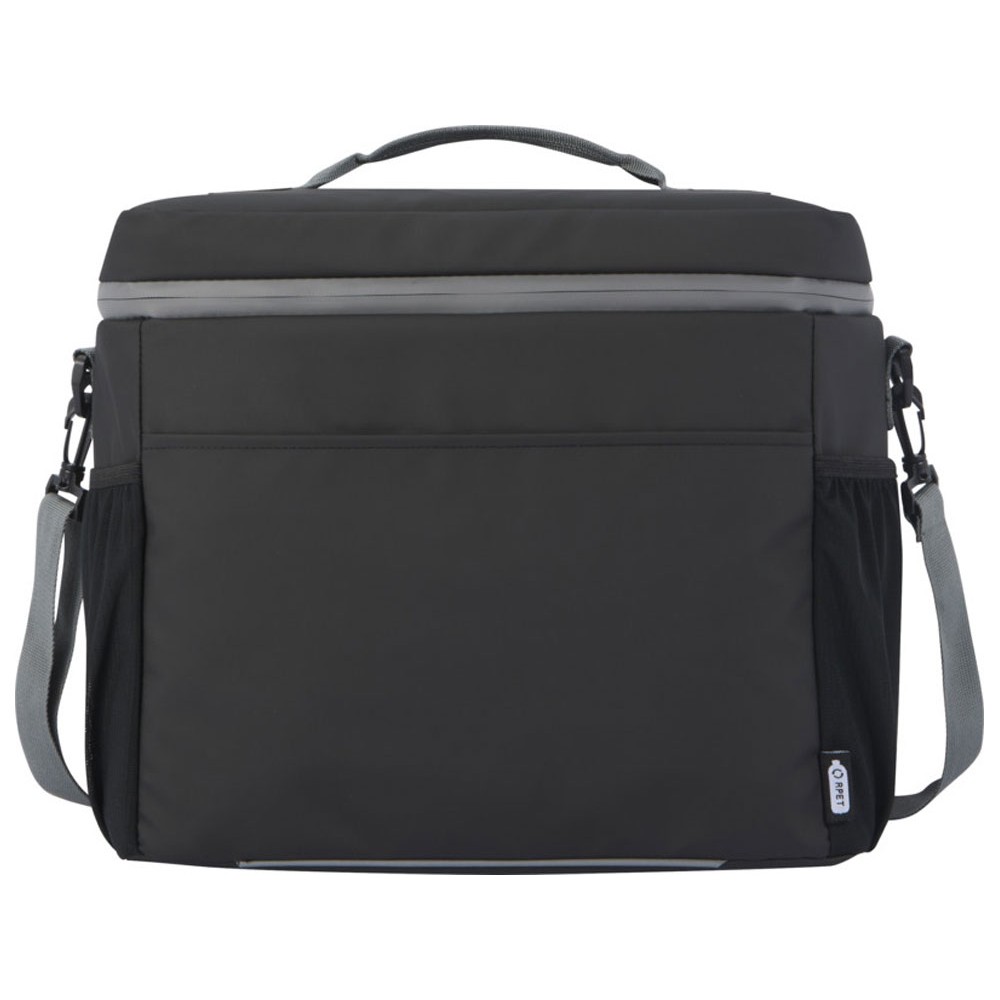 Водонепроницаемая сумка-холодильник на 20 банок, изготовленная из переработанных материалов, сертифицированных согласно стандарту GRS, включая молнии. Имеет просторное отделение на молнии с подкладкой из безопасного для пищевых продуктов и очень толстого теплового PEVA высокой плотности и пенной изоляцией, позволяющей хранить напитки и закуски холодными в течение нескольких часов. Также имеет 2 сетчатых кармана и один открытый передний карман как дополнительное место для хранения. Тканевая ручка для переноски и регулируемый плечевой ремень с мягкой подкладкой обеспечивают удобное ношение. Из переработанных материалов, сертифицированных по стандарту GRS, изготовлены основная ткань, подкладка, лямки и застежки-молнии. Емкость: 22 литра. Не содержит ПВХ.