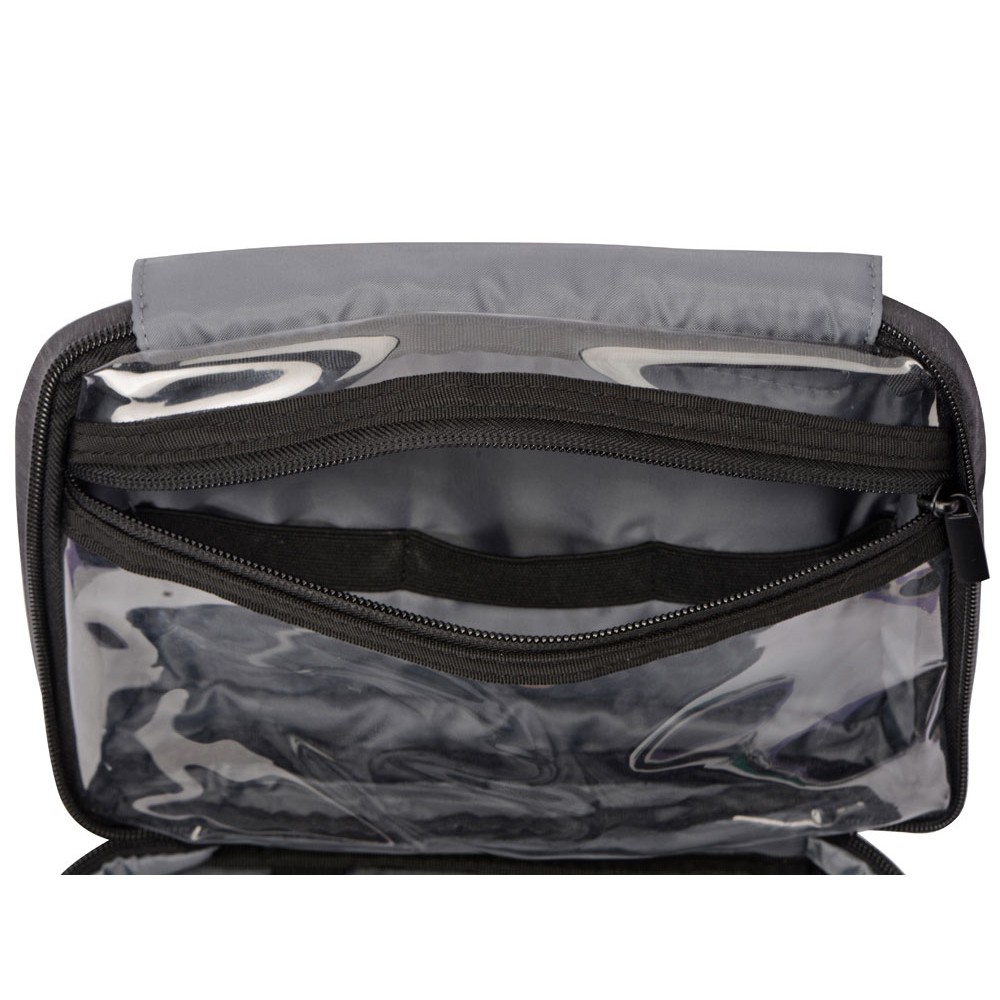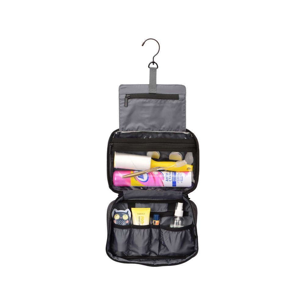 Несессер раскладывается как книжка на две створки и дополнительную секцию с металлическим крючком для подвешивания, карманом на молнии и фиксирующей резинкой. Металлический крючок позволяет подвешивать полностью заполненный несессер, поскольку способен выдержать большой вес, кроме того, вешалка проворачивается вокруг своей оси, что позволяет использовать эту модель с рейлами или в шкафу. Центральная секция имеет прозрачное большое отделение на молнии из ПВХ, внутри которого — три фиксирующих резинки для флаконов или иных принадлежностей. Благодаря выбранному материалу это отделение легко можно протереть влажной салфеткой, если содержимое бутылочки с шампунем или иной косметикой протекло. Вторая створка состоит из большого плоского кармана на молнии, двух резинок, которые подойдут для фиксации зубной щетки, двух узких и двух квадратных карманов.