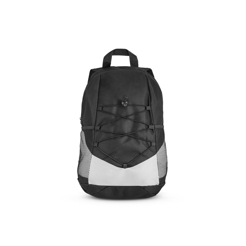 Рюкзак из 600D с боковыми карманами из сетки и одним внутренним. Задняя часть и плечевые ручки с набивкой. 250 x 420 x 180 мм