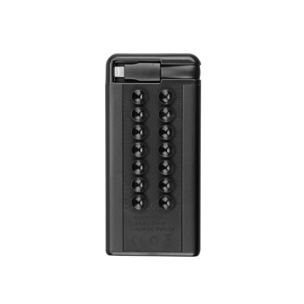 Портативное зарядное устройство (power bank) Octopus, 4000 mAh в тонком металлическом корпусе. На одной стороне расположены силиконовые присоски, благодаря которым смартфон или планшет станет единым целым с зарядным устройством. На другой имеется большая поверхность под нанесение. Внешний аккумулятор снабжен универсальным компактным кабелем 2-в-1 с разъемами usb-micro и Lightning. Универсальный кабель крепится в углубление на корпусе повербанка.
