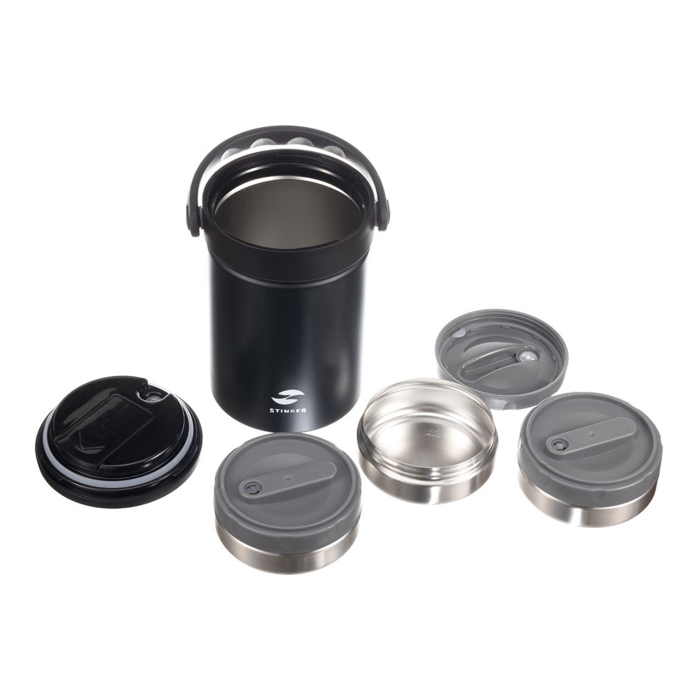 • Термос ланч-бокс Stinger, 1,7 л, широкий, сталь, чёрный, три контейнера, 16,1 x 14,9 x 21,5