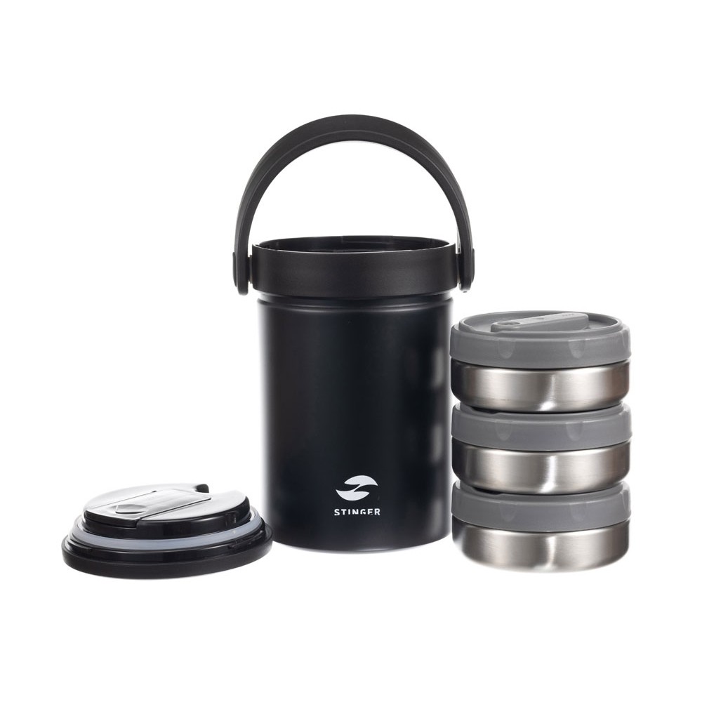 Термос ланч-бокс Stinger, 1,7 л, широкий, сталь, чёрный, три контейнера, 16,1 x 14,9 x 21,5