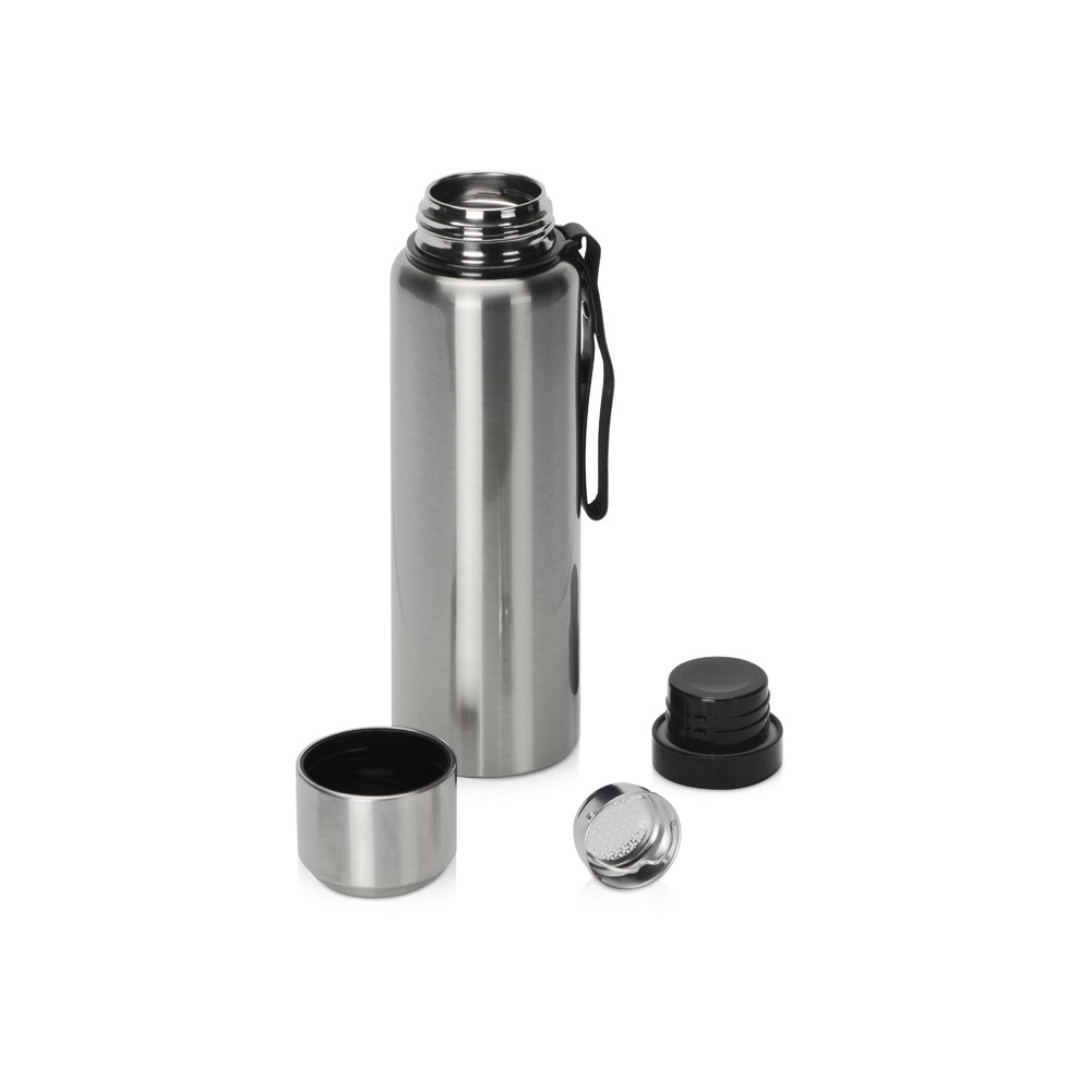 Вакуумный термос c двойными стенками из «пищевой» нержавеющей стали 304 марки для небольших путешествий и отдыха на природе. Надежно удерживает тепло и холод в течение 24 часов. Крышку можно использовать в качестве чашки. В комплекте имеется съемное ситечко из нержавеющей стали. Имеется прочный и удобный ремешок для переноски. Объем 800 мл.
