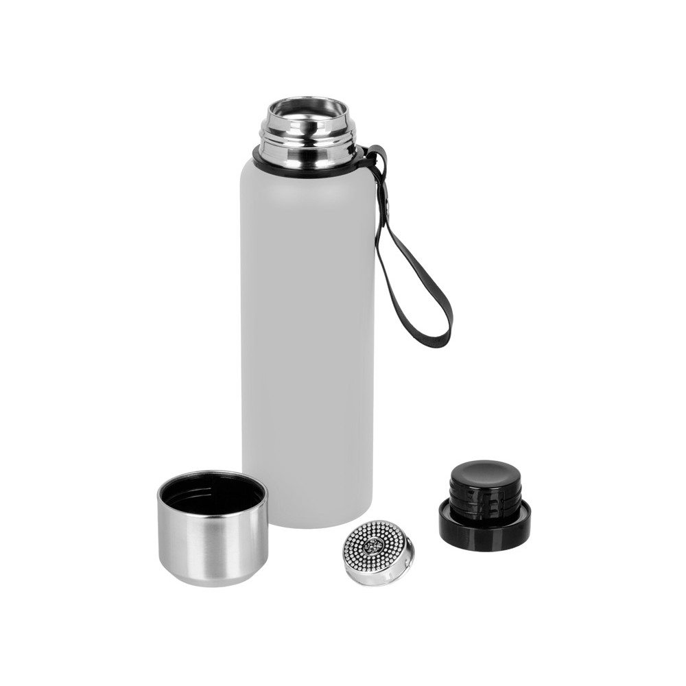 Вакуумный термос c двойными стенками из «пищевой» нержавеющей стали 304 марки для небольших путешествий и отдыха на природе. Надежно удерживает тепло и холод в течение 24 часов. Крышку можно использовать в качестве чашки. В комплекте имеется съемное ситечко из нержавеющей стали. Имеется прочный и удобный ремешок для переноски. Корпус покрыт специальной порошковой краской для надежного хвата и защиты от царапин. Объем 800 мл.
