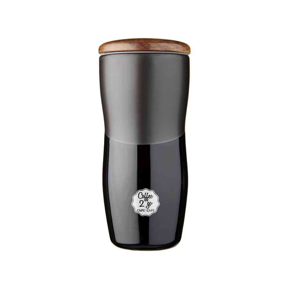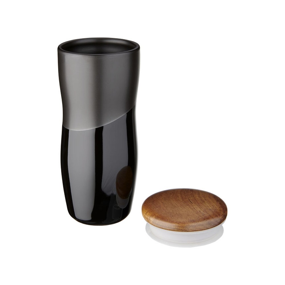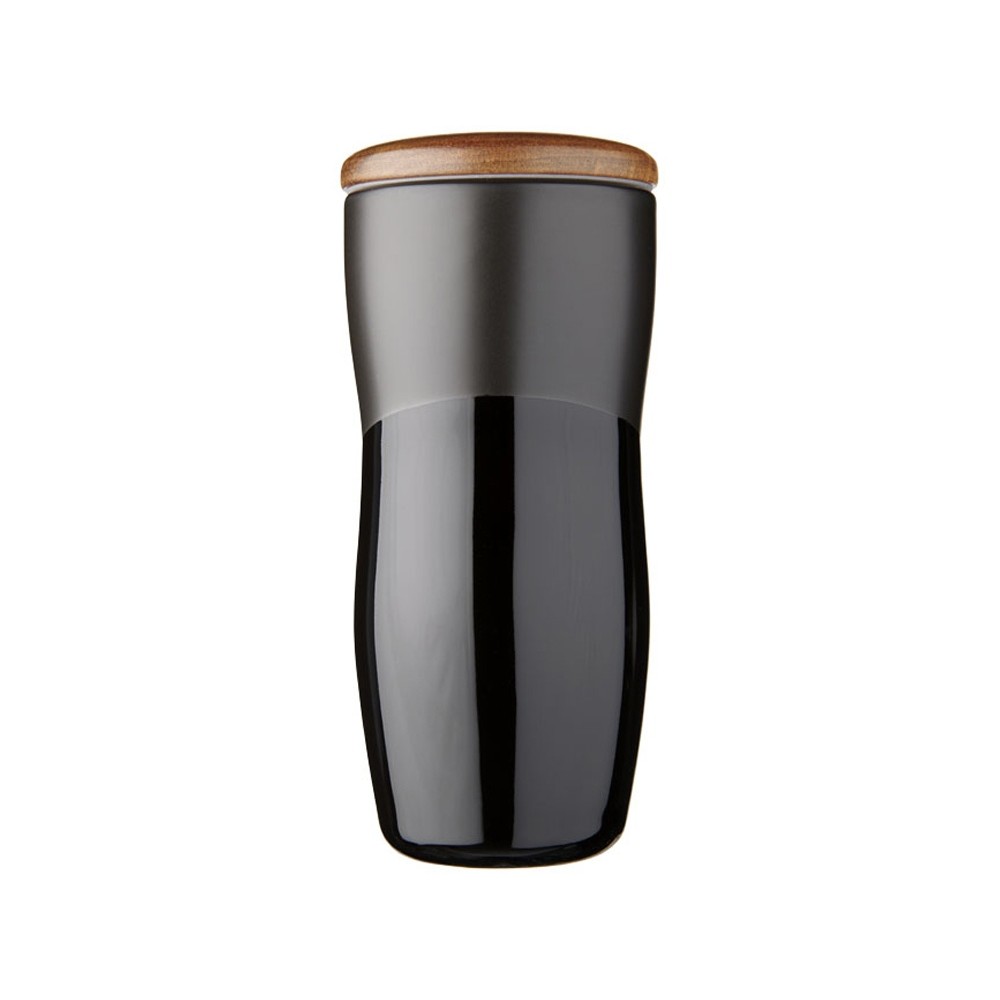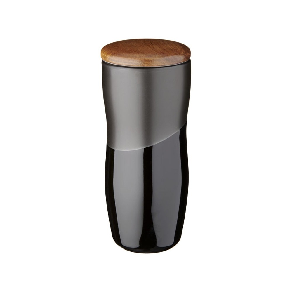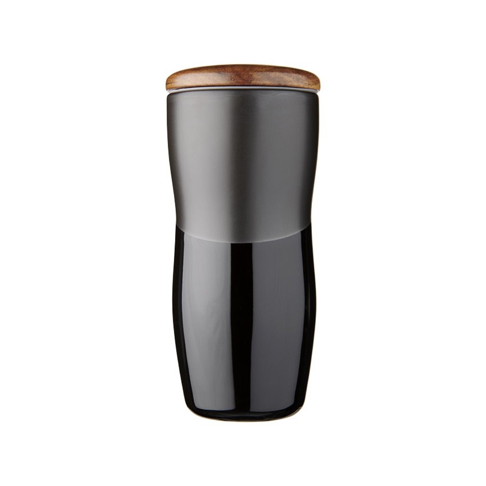 Двустенная керамическая термокружка Reno объемом 370 мл. Двустенная керамическая термокружка с контрастным дизайном из матового и блестящего покрытия. Кроме того, двустенная керамическая конструкция препятствует образованию конденсата на внешней стороне стакана. Оснащена деревянной нажимной крышкой.
